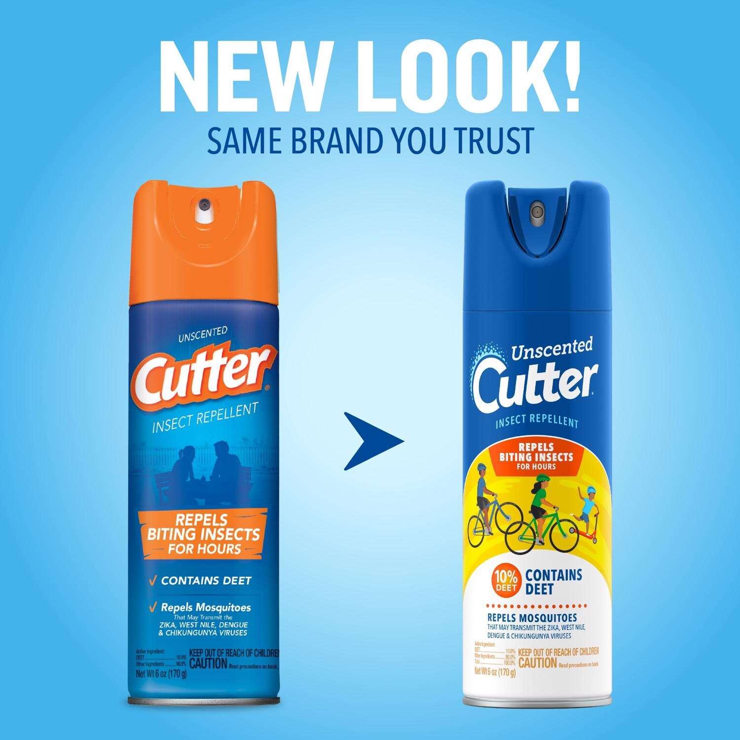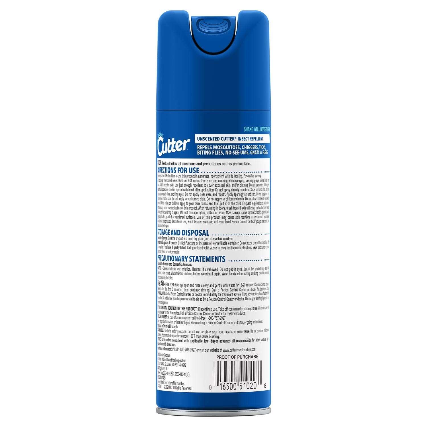 Unscented Cutter Insect Repellent repels annoying biting insects for hours frequent reapplication is unnecessary. The 10 percent Deet formula repels mosquitoes, including those that may transmit the Zika, West Nile, Dengue and Chikungunya viruses. This gentle but effective formula also wards off other annoying insects, such as ticks, biting flies, gnats, no-see-ums, chiggers and fleas. To apply, hold can 6 - 8 inches from skin and clothing while spraying, using just enough repellent to cover exposed skin and/or clothing. Unscented Cutter Insect Repellent is a convenient aerosol formula, perfect for the entire family.