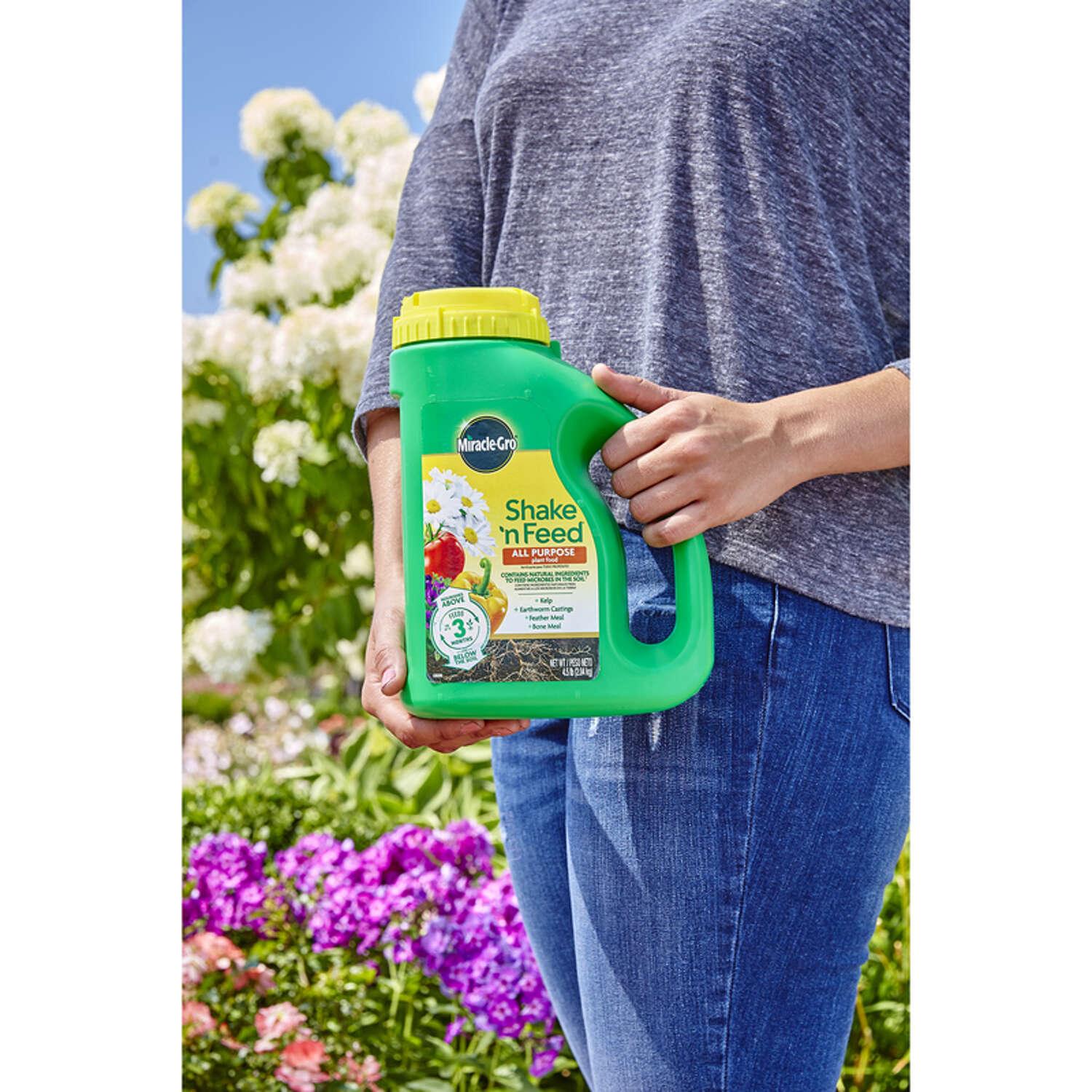 Miracle-Gro Shake 'n Feed all purpose plant food is specially formulated to help grow stronger, vibrant and more productive plants (versus unfed plants). Formulated with kelp, earthworm castings, feather meal and bone meal in an all-in-one particle to feed microbes in the soil. You can use Miracle-Gro Shake 'n Feed all purpose plant food anywhere in-ground and in containers for feeding for up to 3 months. Feed your plants with the help of Miracle-Gro Shake 'n Feed all purpose plant food.