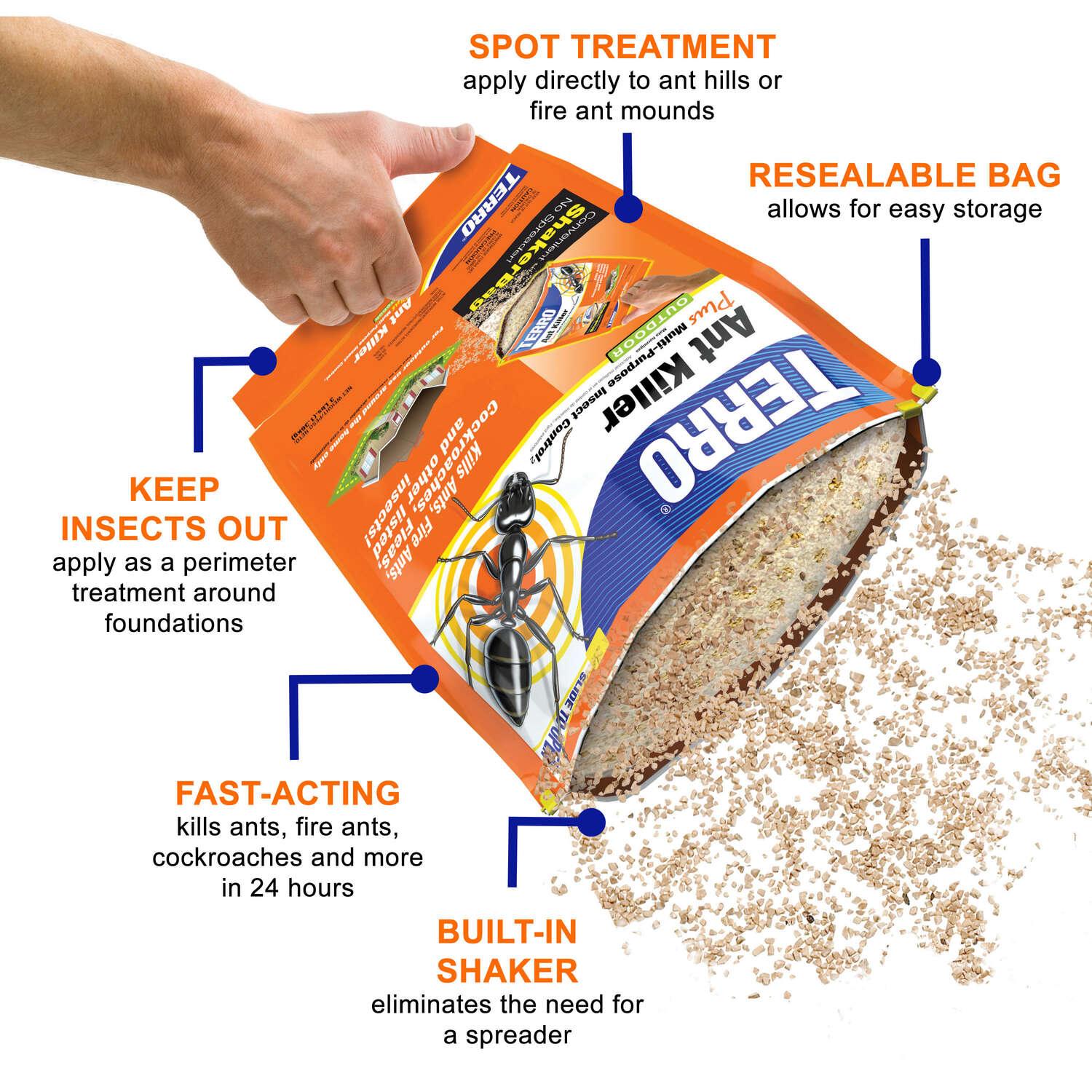 Create a barrier against ants, fire ants, roaches, fleas, earwigs and more with TERRO Ant Killer Plus. This fast-acting treatment works within 24 hours to keep your home free of the most persistent pest insects, while also offering residual control. For increased effectiveness, this product can be applied as a perimeter treatment around the foundation of your home, spread on lawns, or used a spot treatment on ant hills and fire ant mounds. TERRO Ant Killer Plus is packaged in a resealable shaker bag to allow for easy application. Simply open the top, grab the handle located at the bottom of the bag, and start spreading the granules. There’s no need to use a spreader! To apply as a perimeter treatment, create a 3 to 10-foot band of granules along your foundation. To treat ant hills (except fire ants), apply 1 to 2 teaspoons on granules over and around the ant hill. Be sure to water the granules lightly immediately following application. To control fire ants, apply ½ cup of granules over, and 2 feet around each mound. After, apply gently water the product with a minimum of a gallon of water to each mound area. Avoid using a high-pressure hose, which could disturb the ants and cause migration.