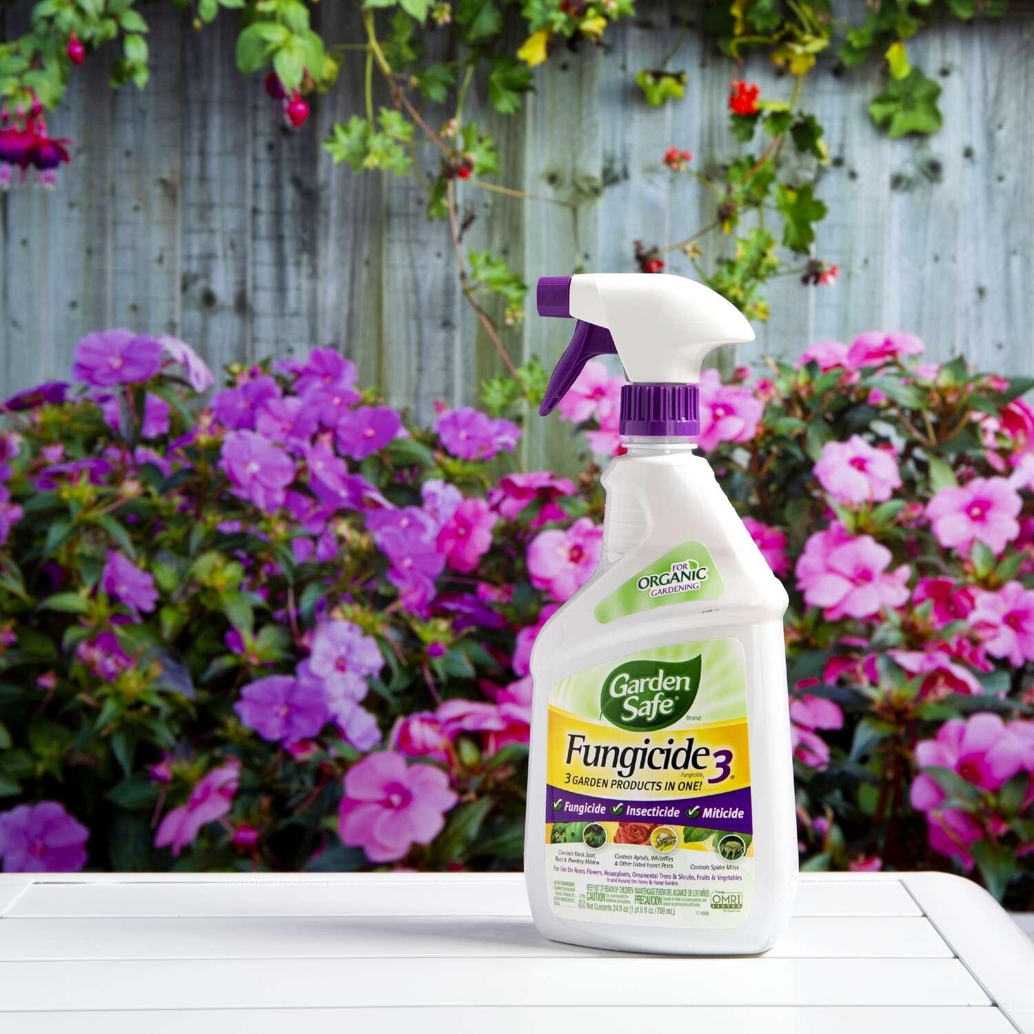 Garden Safe Brand Fungicide3 is designed for organic gardening. This ready-to-use formula acts as a garden fungicide, insecticide and miticide – it’s three garden products in one! Use it on roses, flowers, houseplants, ornamental trees and shrubs, fruits and vegetables in and around the home and home garden. Garden Safe Brand Fungicide3 controls black spot, rust and powdery mildew, and kills aphids, whiteflies, spider mites and other listed insect pests and mites. This formula kills eggs, larvae and adult insects. Use it right up onto the day you harvest treated plants. Spray for complete coverage of all plant tissue. OMRI (Organic Materials Review Institute) Listed. As with other oil-based products, time applications to early morning/late evening to minimize the potential for leaf burn.