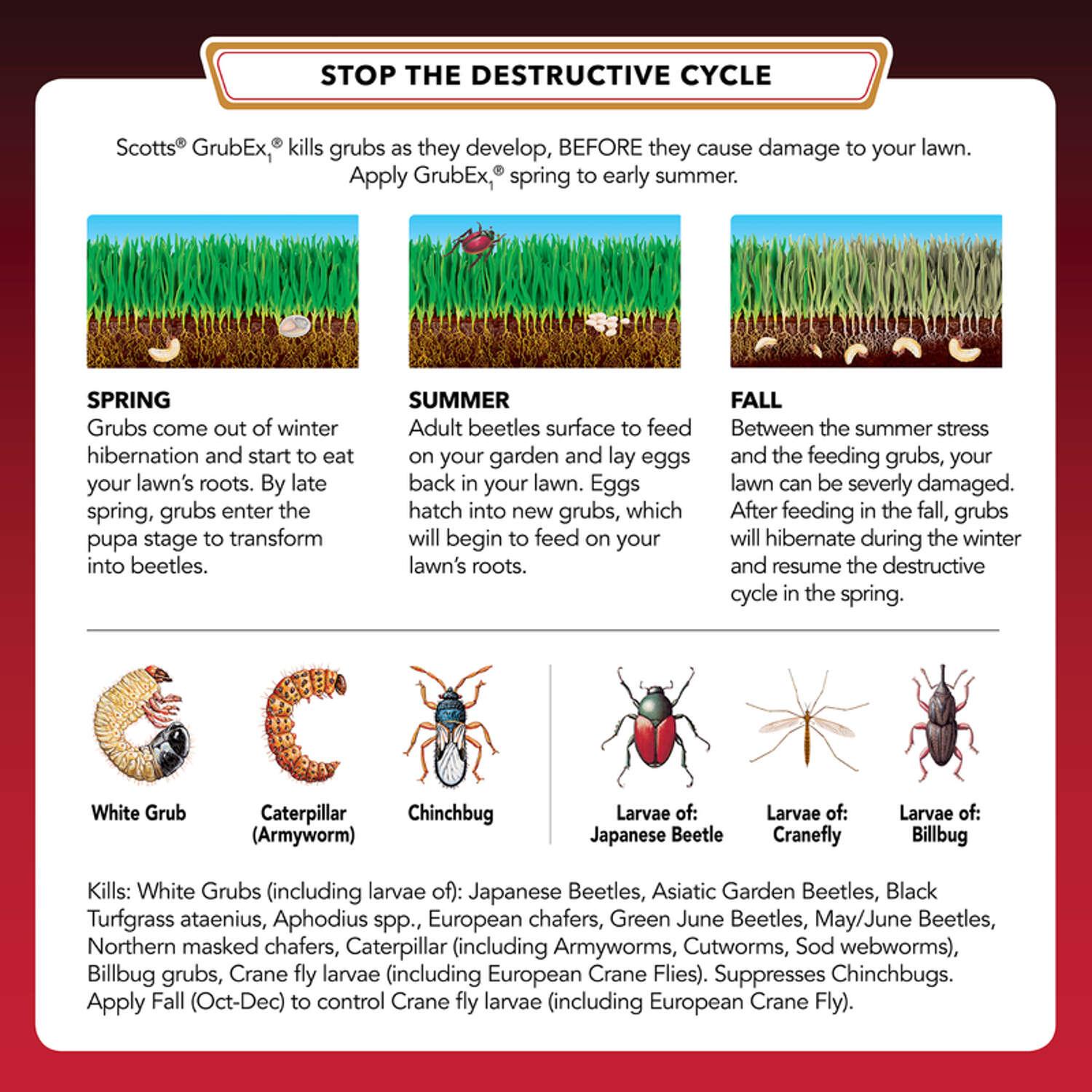 Prevent grubs from damaging your lawn with Scotts® GrubEx®1 Season Long Grub Killer. A single application can stop and prevent grubs all season long. Apply during spring or early summer to kill grubs as they develop. Using Scotts® GrubEx®1 Season Long Grub Killer annually can also help control Japanese beetle infestations as well as armyworms. Easily apply with a Scotts® broadcast, drop, handheld, or Wizz® spreader and stop grubs before they damage your lawn.