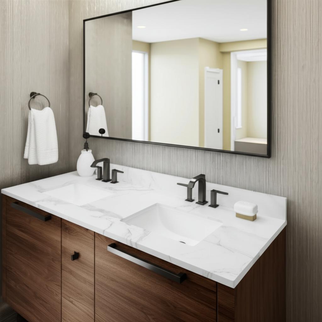 - Elegant Design: Features a Calacatta white engineered stone top for a natural and sophisticated look.