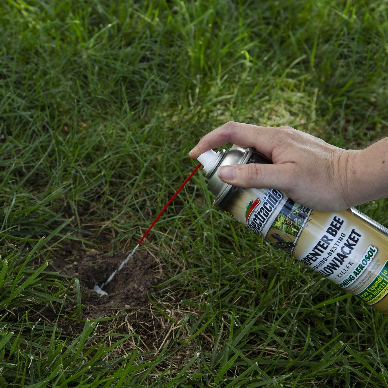 Spectracide Carpenter Bee & Ground-Nesting Yellowjacket Killer Foaming Aerosol expands to hard-to-reach areas where insects live. The extension tube helps to direct spray into target treatment areas. For carpenter bees, treat active tunnels where activity has been observed. Leave the entrance hole open for 48 hours after application to allow the bees to contact and distribute the insecticide throughout the nest galleries. Then plug the entrance hole to prevent reinfestation of old nesting tunnels and reduce the chances of wood decay. For ground-nesting yellowjackets, use the extension tube to spray Spectracide Carpenter Bee & Ground-Nesting Yellowjacket Killer Foaming Aerosol directly into holes in the ground where yellowjacket activity has been observed. After 24 hours, cover the hole with soil. For best results, spray early in the morning or late in the evening when yellowjacket activity is low and most yellowjackets are in the nest. Read the entire label before use.