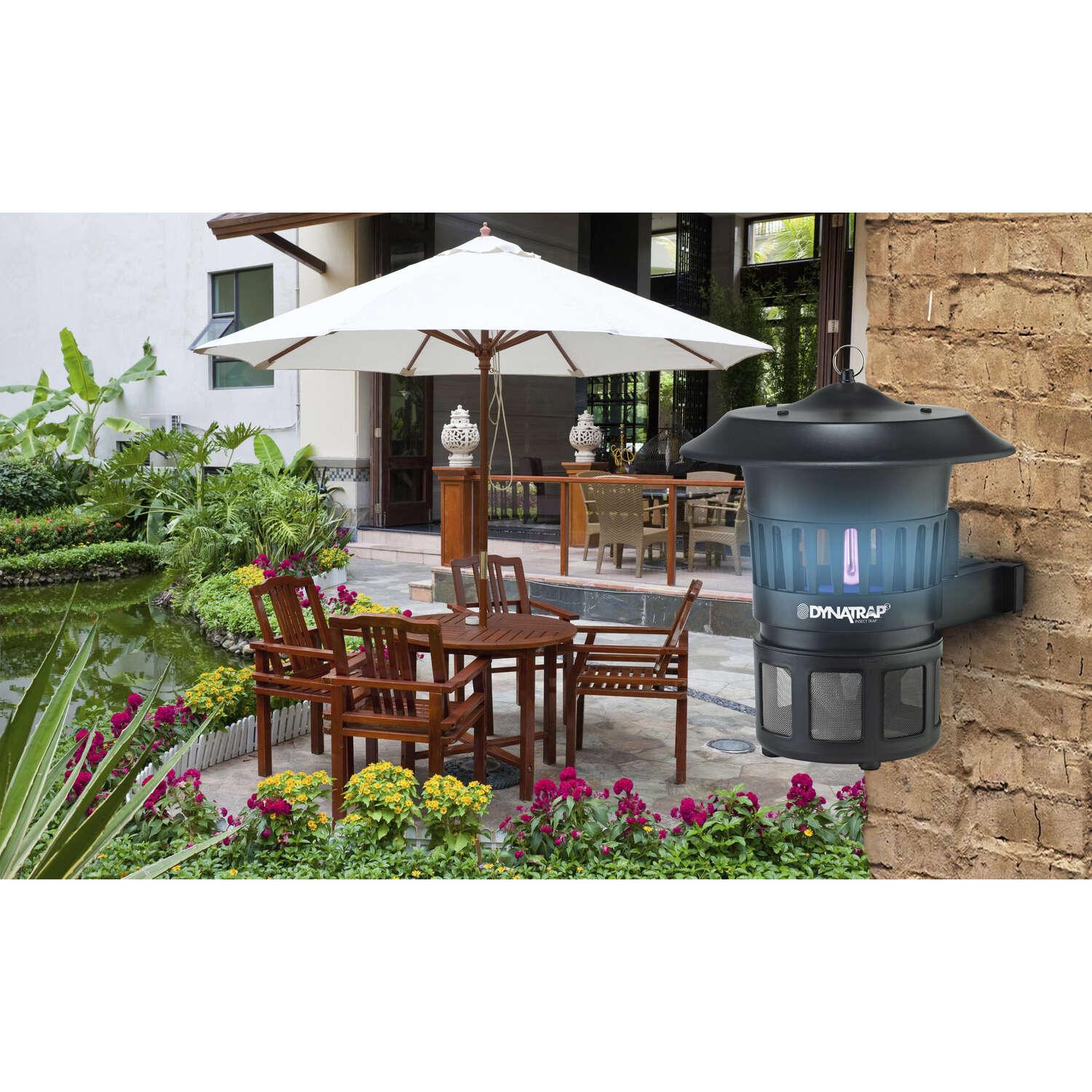 The DynaTrap Insect Trap with Optional Wall Mount attracts and traps flying insects while also providing versatility in placement. Designed with varied placement in mind, this trap allows you to mount traps from a wall, hang from a hook, or place on a flat surface so you can be protected no matter where you are on your property. The insect trap provides ½ acre of coverage and comes with wall mounts for your convenience. While the DynaTrap Insect Trap is versatile and durable, even in adverse weather conditions. This trap is engineered for 3-way protection. First, a UV fluorescent bulb generates a warm light, attracting insects. Then a second lure, an exclusive Ti02 titanium dioxide-coated surface, produces CO2 that's irresistible to mosquitoes. Third, a powerful yet whisper-quiet vacuum fan sucks insects into the retaining cage where they dehydrate and die.