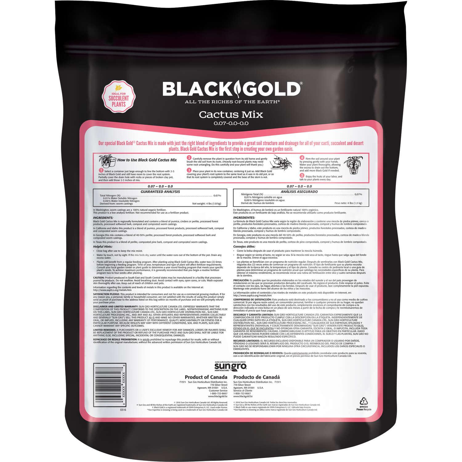 Our special cactus mix combines pumice, earthworm castings, compost and forest humus to provide the perfect soil structure and drainage for all types of cacti, bromeliads and succulents. Black Gold cactus mix is the first step in creating your own garden oasis.