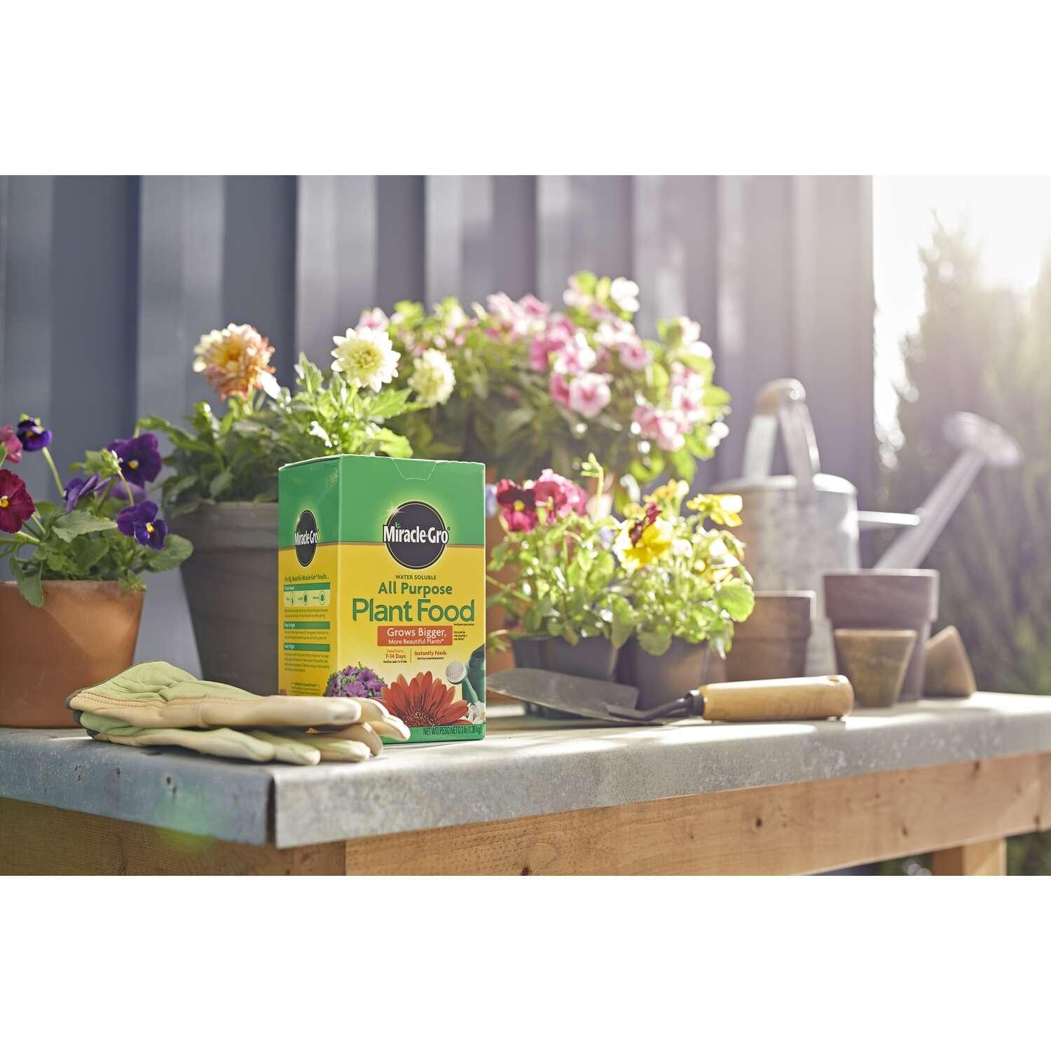Full of essential nutrients, Miracle-Gro Water Soluble All Purpose Plant Food instantly feeds vegetables, trees, shrubs and houseplants to grow bigger and more beautiful than unfed plants. Simply feed them every 1-2 weeks. The formula is safe for all plants and is guaranteed not to burn when used as directed. Get beautiful results with Miracle-Gro.
