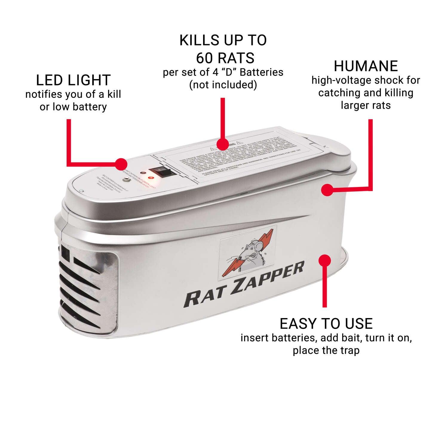 - Kills up to 60 rats per set of 4 "D" batteries (not included)