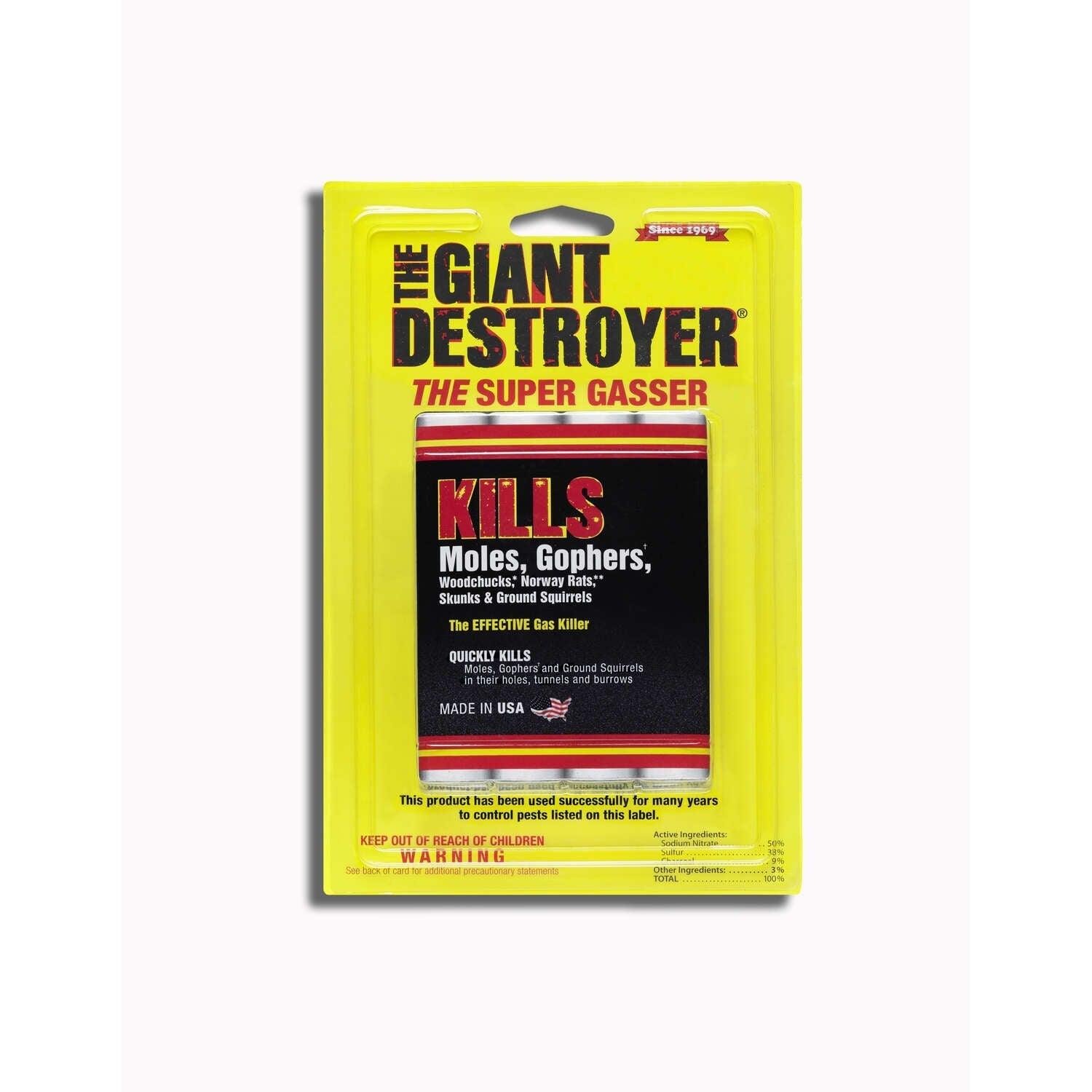 The Giant Destroyer smoke bombs produce a gas when ignited and dropped into burrows that will kill moles, gophers, woodchucks, rats, skunks and ground squirrels.