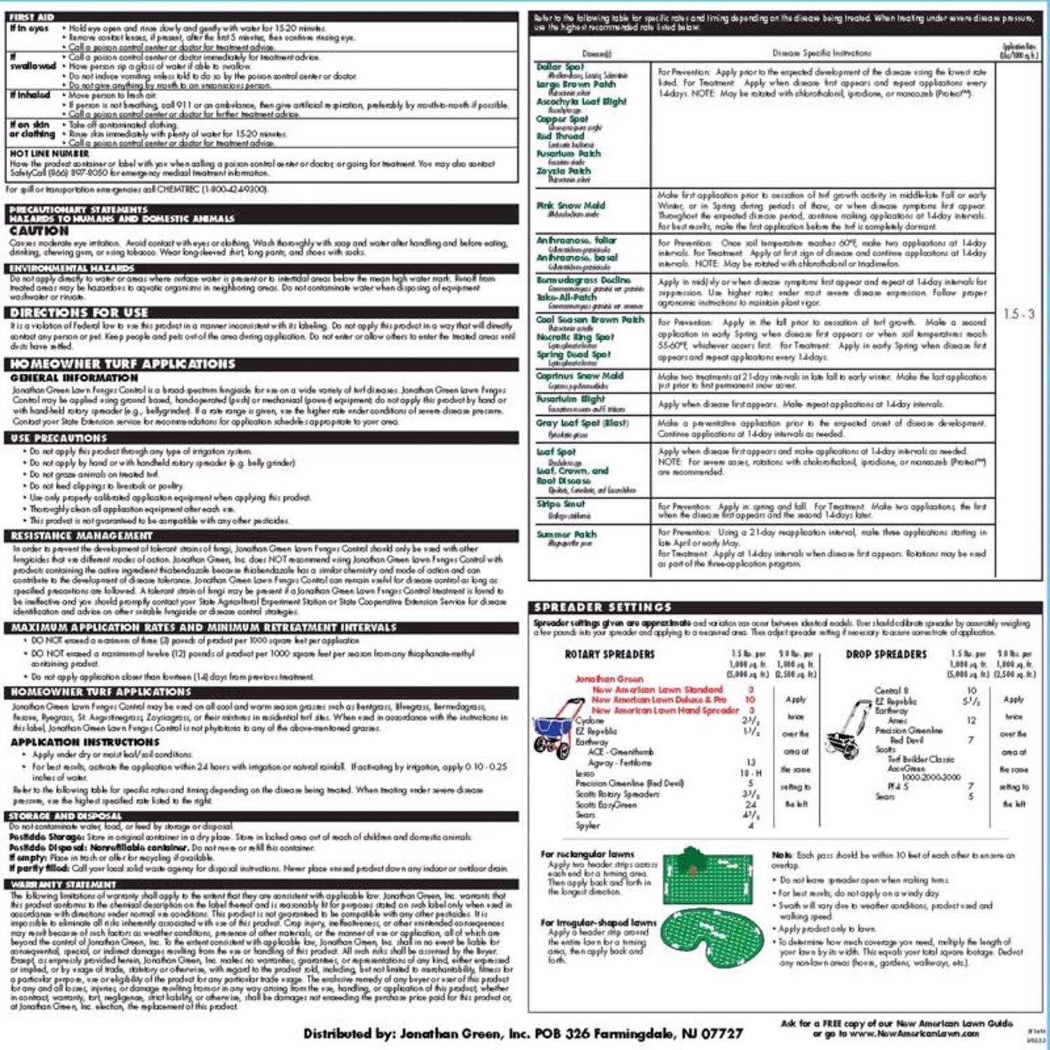 Jonathan Green’s Lawn Fungus Control is a broad spectrum granular fungicide that combats turf diseases. Use this product as a preventative measure in areas where fungus has been a problem in the past to stop it from recurring. In preventative instances, the lighter rate will be enough. Once the disease occurs however, the heavier curative rate is likely to be needed. Please bear in mind that Jonathan Green Lawn Fungus Control can only prevent or stop the disease- it will not repair the damage which has already happened. In such cases, re-seeding will be necessary to replace the damaged grass and thicken the lawn. Use a lawn spreader to uniformly apply. To select the proper setting see the Spreader Settings section in the accordion below. Do not apply by hand or with a hand-held spreader. See the product label for information on disease resistance management. Apply around the perimeter of the lawn to establish a turning area. Then run the spreader back and forth within the area outlined by your first perimeter application. Always allow an overlap to avoid gaps in coverage. To protect the environment, do not allow the product to enter or runoff into storm drains, drainage ditches, gutters or surface waters. See the product label for further information. Sweep any excess granules off of hard surfaces onto the lawn. Irrigate the lawn lightly with 1/2 inch of water or rainfall immediately after application to activate the product. Dead patches in the lawn will need to be raked out and reseeded. If fungus returns in the lawn year-after-year, use Jonathan Green Love Your Soil with Lawn Fungus Control once or twice a year to improve the health of the soil and help prevent disease. Make the first application before the air temperature reaches 75 °F.