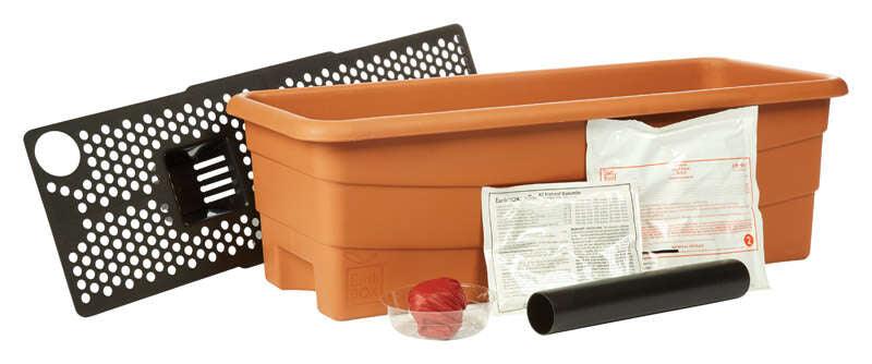 • What's Included: 1 Terracotta Earthbox Jr. Container, 8oz. Organic 8-3-5 Fertilizer, 8oz. Organic Dolomite, 1 Jr. Aeration Screen, 1 Jr. Water Fill Tube, 2 Jr. Black & White Reversible Mulch Covers, 1 4in. Overflow Saucer, Instruction Sheet & Planting Guide