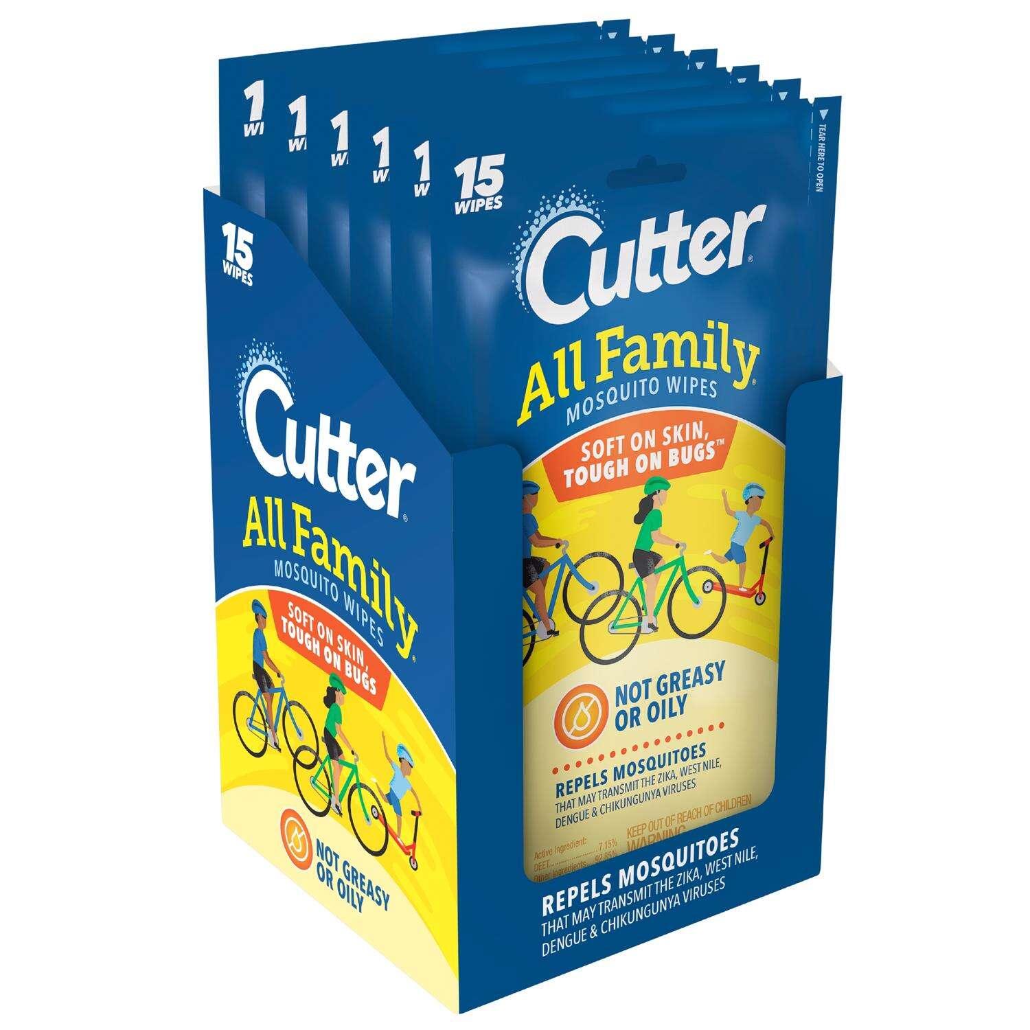 Cutter All Family Mosquito Wipes are soft on skin but tough on bugs. These towelettes are formulated with 7.15 percent DEET formula to repel mosquitoes, including those that may transmit the Zika, West Nile, Dengue and Chikungunya viruses. Cutter All Family Mosquito Wipes never feel greasy or oily on your skin. The gentle but effective formula also wards off other annoying insects, including ticks, biting flies, gnats, no-see-ums, chiggers and fleas. For outdoor use only. Cutter All Family Mosquito Wipes allow for controlled application of insect repellent to face, ears and neck. Resealable package for multiple outings.