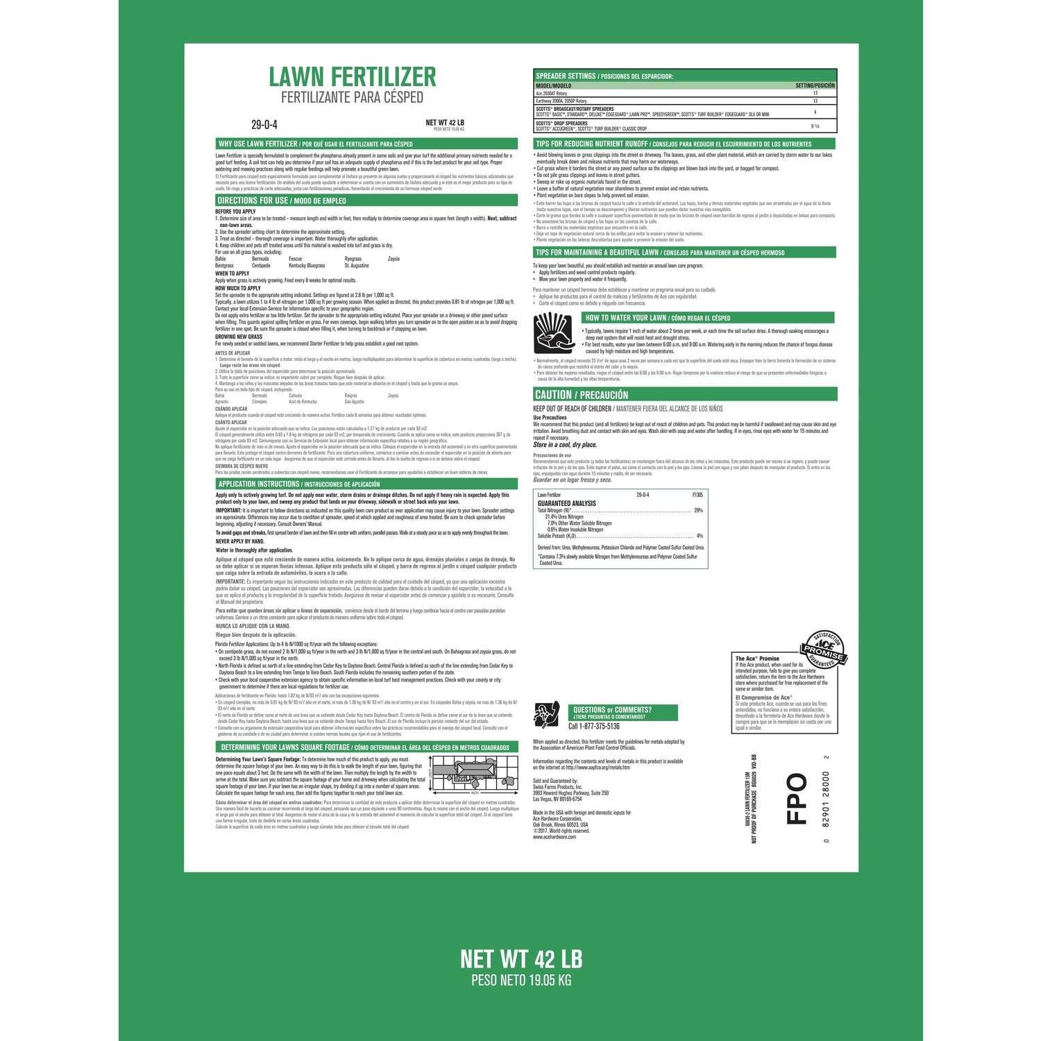 Ace® Lawn Fertilizer feeds your lawn in one easy step. This product builds strong, deep roots to protect from drought and heat, and provides controlled release feeding up to 8 weeks. Formulated for quick greening. For optimal results, feed your lawn every 8 weeks when grass is actively growing. Carries the Ace Promise satisfaction guarantee.