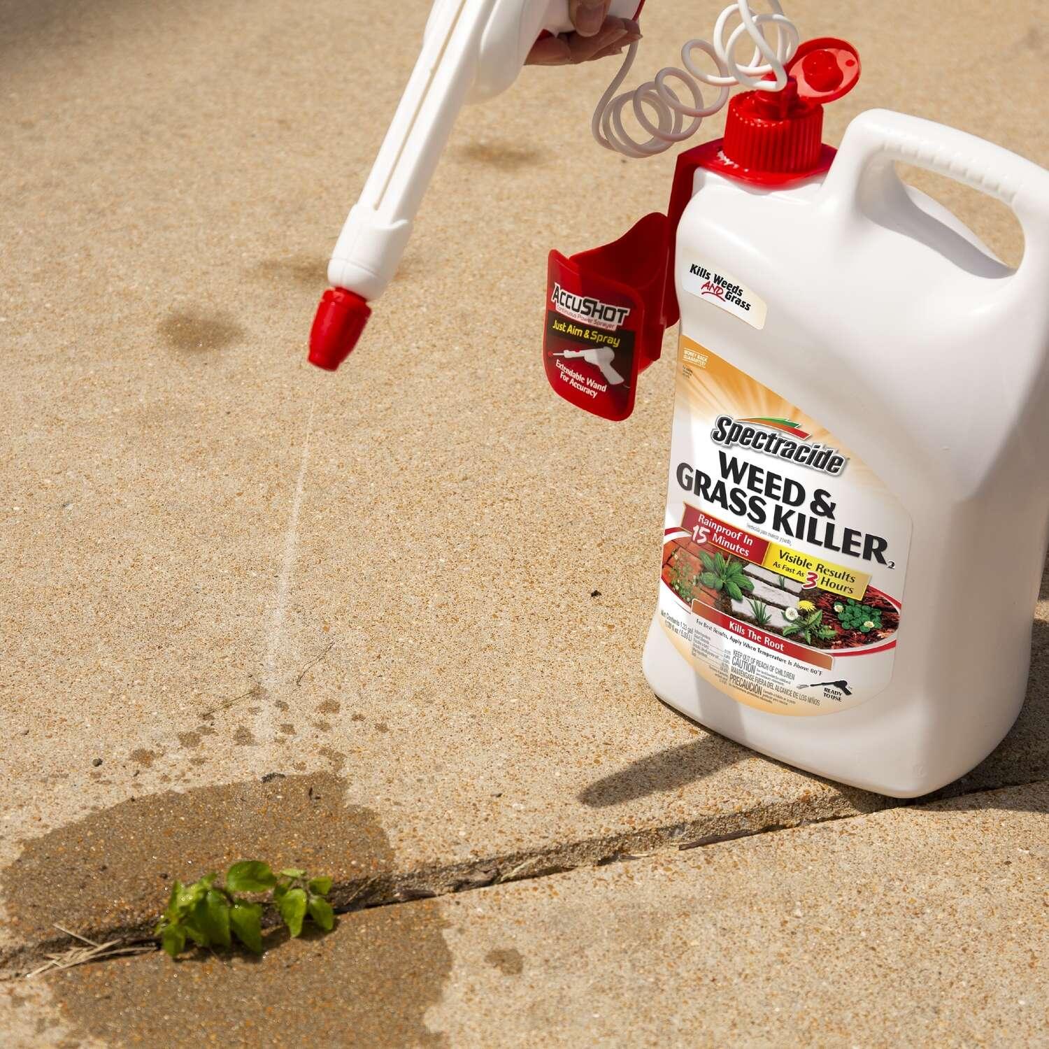 Spectracide Weed & Grass Killer with the AccuShot continuous power sprayer is a nonselective weed and grass killer that kills all types of weeds and grasses down to the root. Our easy-to-use, fast-acting insect, lawn disease and weed control solutions help you tame lawn and landscape invaders with incredible pest-punishing power. Plant new flowers, trees and shrubs in the treated area after just 1 day. When used as directed, Spectracide Weed & Grass Killer works the first time, every time. For best results, apply this ready-to-use spray during warm, sunny weather when the temperature is over 60 degrees. Protect desirable plants with a piece of plastic or cardboard - if desirable plants are accidentally sprayed, wash with water immediately. Do not mow, cut or otherwise disturb treated vegetation for at least 7 days following application. Do not use on or around edible feed or food crops. AccuShot continuous power sprayer with an extendable wand that makes it easy to target the weeds or grass you want to kill.