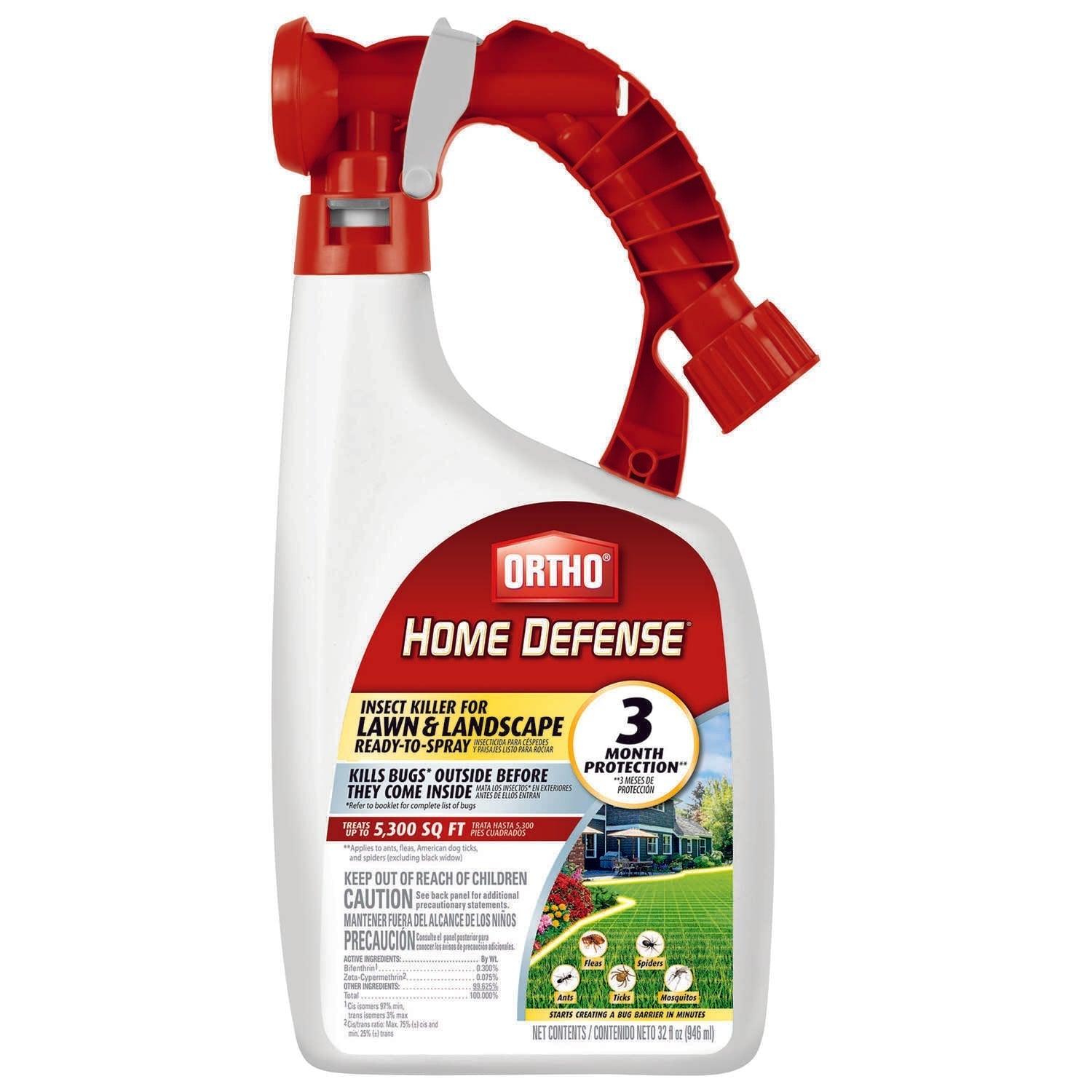 Ortho® Home Defense® Insect Killer for Lawn & Landscape Ready-To-Spray provides 3 months of protection from bugs. It kills insects, including fleas, ticks, spiders and more, outside the home before they can come inside while starting to create a long lasting bug barrier in just minutes. Satisfaction is guaranteed or your money back. Ortho® Home Defense® Insect Killer for Lawn & Landscape spray treats up to 5,300 sq. ft. Applies to ants, fleas, spiders (excluding black widow) and American dog ticks.