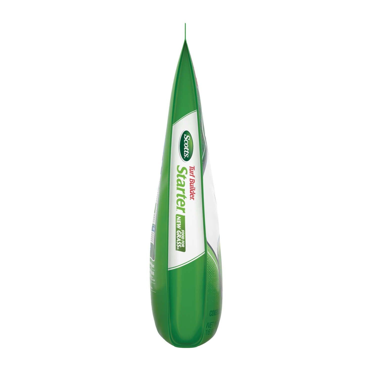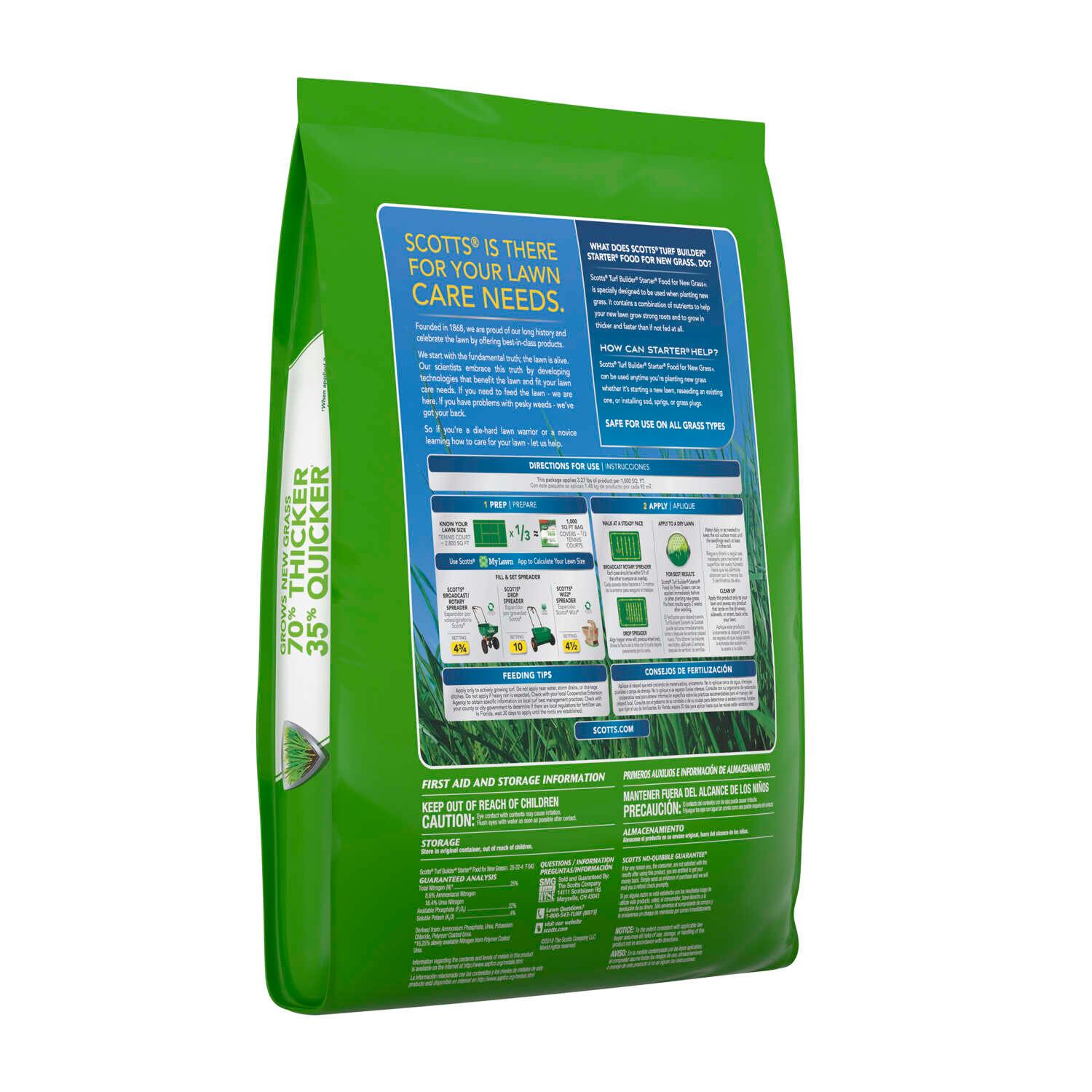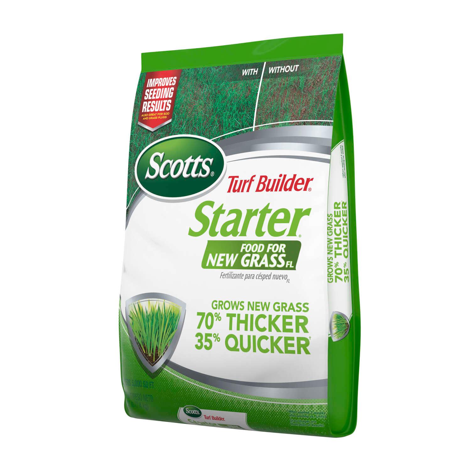 With Scotts Turf Builder Starter Food for New Grass FL, your seedlings will benefit from a combination of nutrients to satisfy their special needs. The Starter Food gives new grass a quick start by promoting faster root and Grow new grass 70% thicker and 35% quicker with Scotts Turf Builder Starter Food for New GrassFL (when applied 2 weeks after seeding vs. unfed). This fertilizer contains a combination of nutrients to help a new lawn grow strong roots. Can be applied before or after planting new grass. For best results, apply 2 weeks after seeding. Scotts Turf Builder Starter Food for New GrassFL can be used whether you're starting a new lawn, reseeding an existing one, or installing sod, sprigs, or grass plugs.