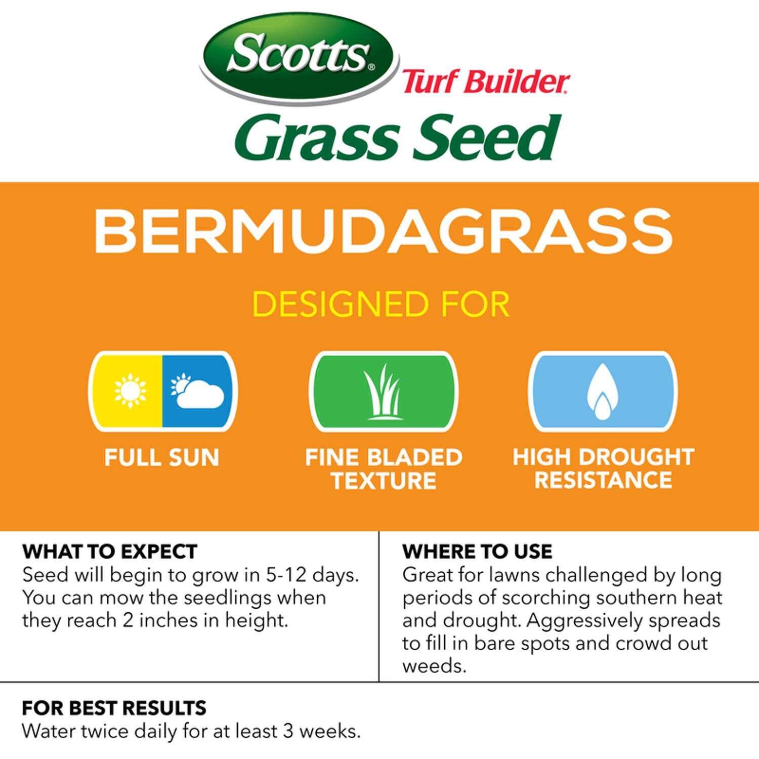 Scotts Turf Builder Grass Seed Bermudagrass is great for lawns challenged by long periods of scorching southern heat and drought. This seed mix aggressively spreads to grow a thick, durable lawn. Each seed is wrapped in a unique 4 in 1 Water Smart Plus Coating that absorbs 2x more water than uncoated seed, feeds with essential nutrients and helps protect seedlings from disease.
