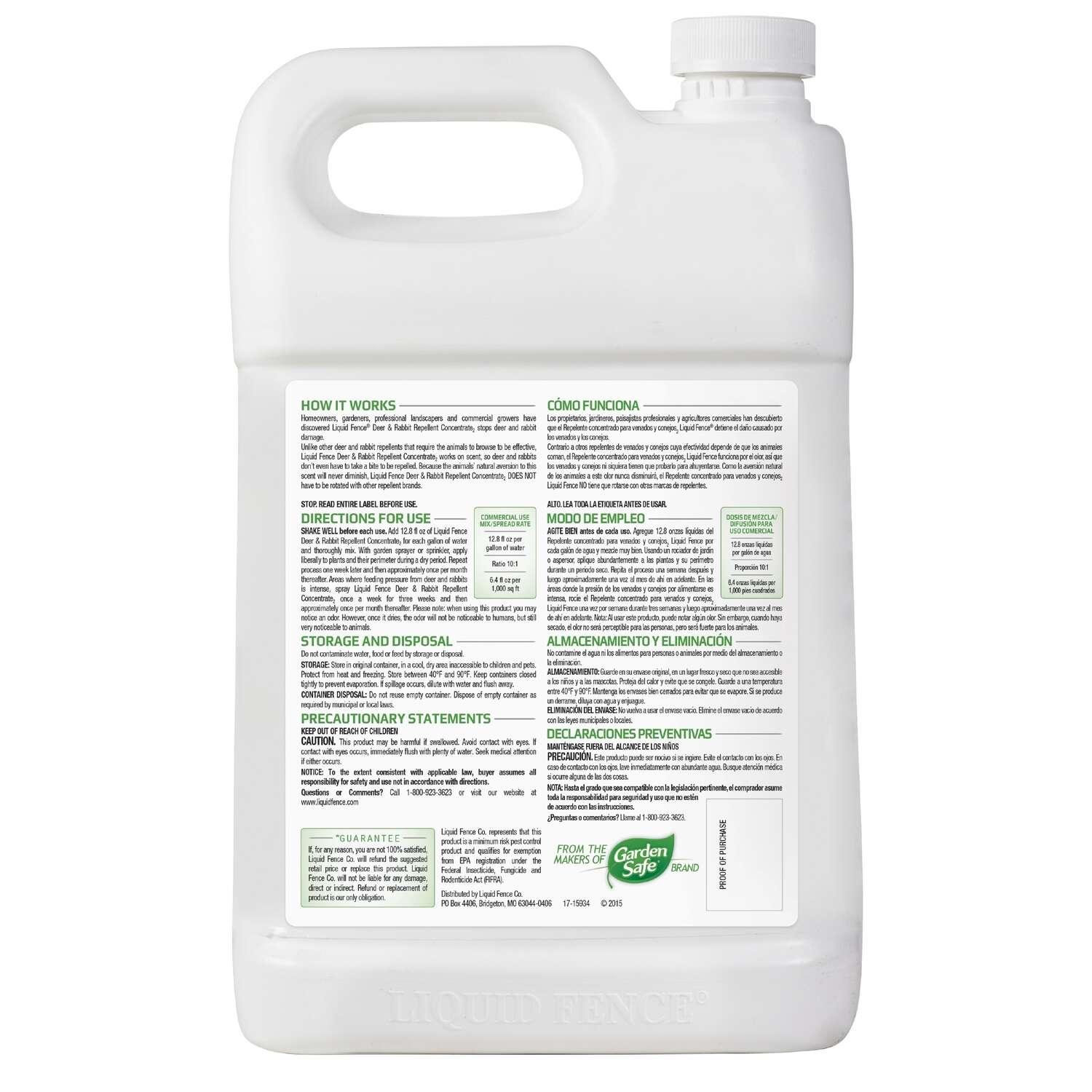 Liquid Fence Deer & Rabbit Repellent Concentrate repels deer and rabbits before they feed! This concentrated liquid formula repels deer and rabbits from landscaped ornamental gardens, flowers, shrubs, trees and vines. The repellent works on scent, so deer and rabbits don’t have to take a bite to be repelled. It is harmless to plants and animals when used and stored as directed, and can be applied year-round. The formula is long-lasting and rain resistant. Animals’ natural aversion to this scent will never diminish – this product does not have to be rotated with other repellent brands. Reapply once a week for 3 weeks, then approximately once a month thereafter. Reapplication is recommended after excessive rainfall.