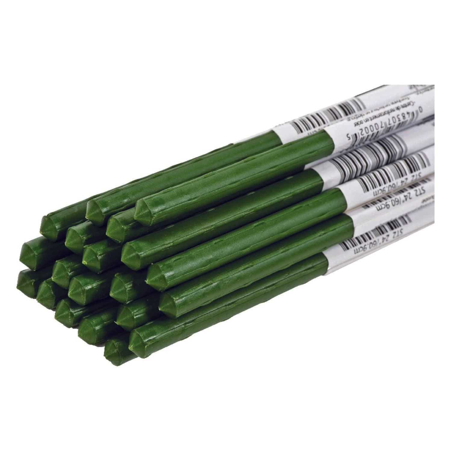 Steel stakes that support plants and are rustproof and weatherproof. Green in color to blend in with natural foliage. Pointed and ribbed for universal garden use.