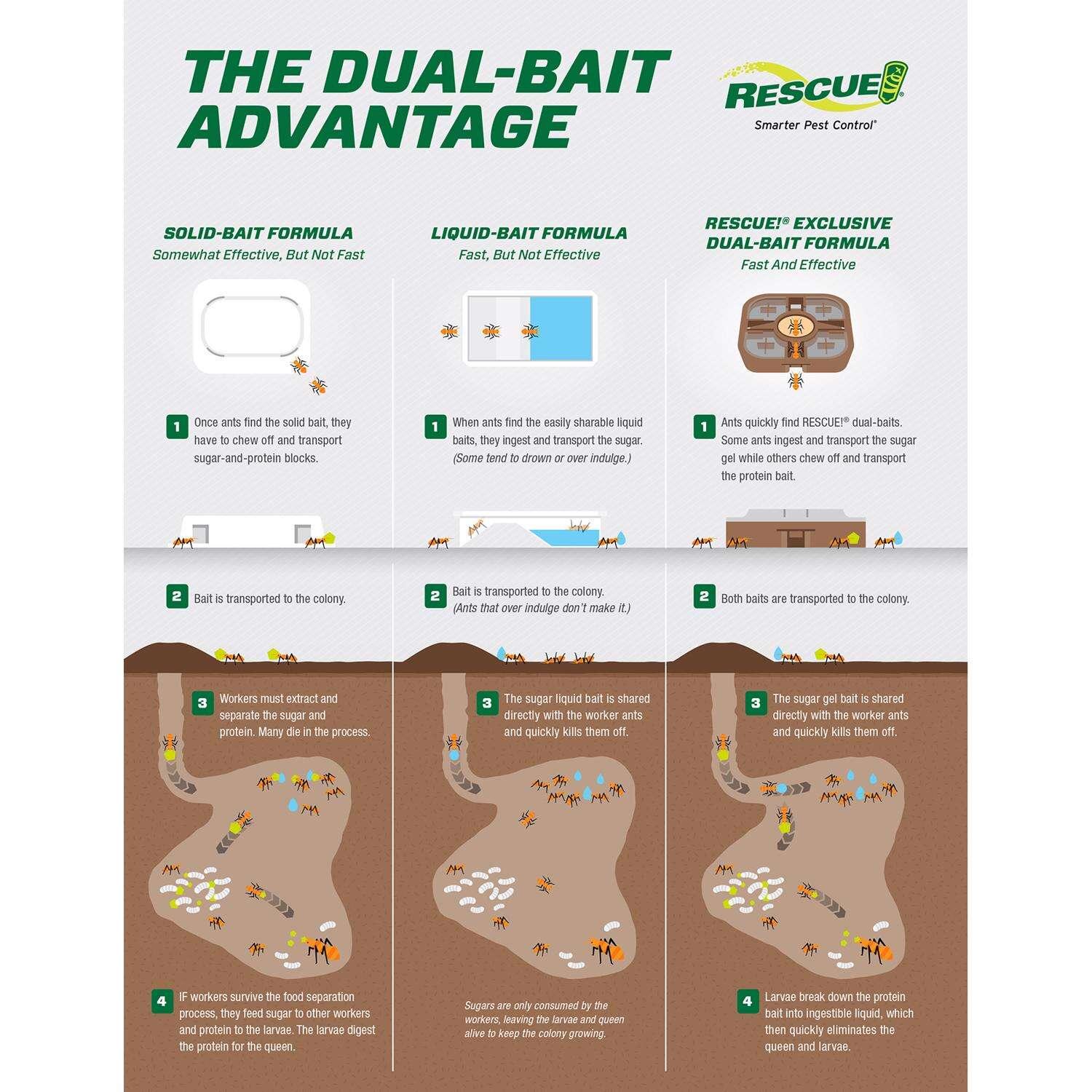 RESCUE! Ant Baits use both sugar and protein lures to entice ants no matter the season or what kind of food they seek. Dual-bait technology means ants find it fast and it feeds more types of ants in the colony for a quick nest knockdown.
