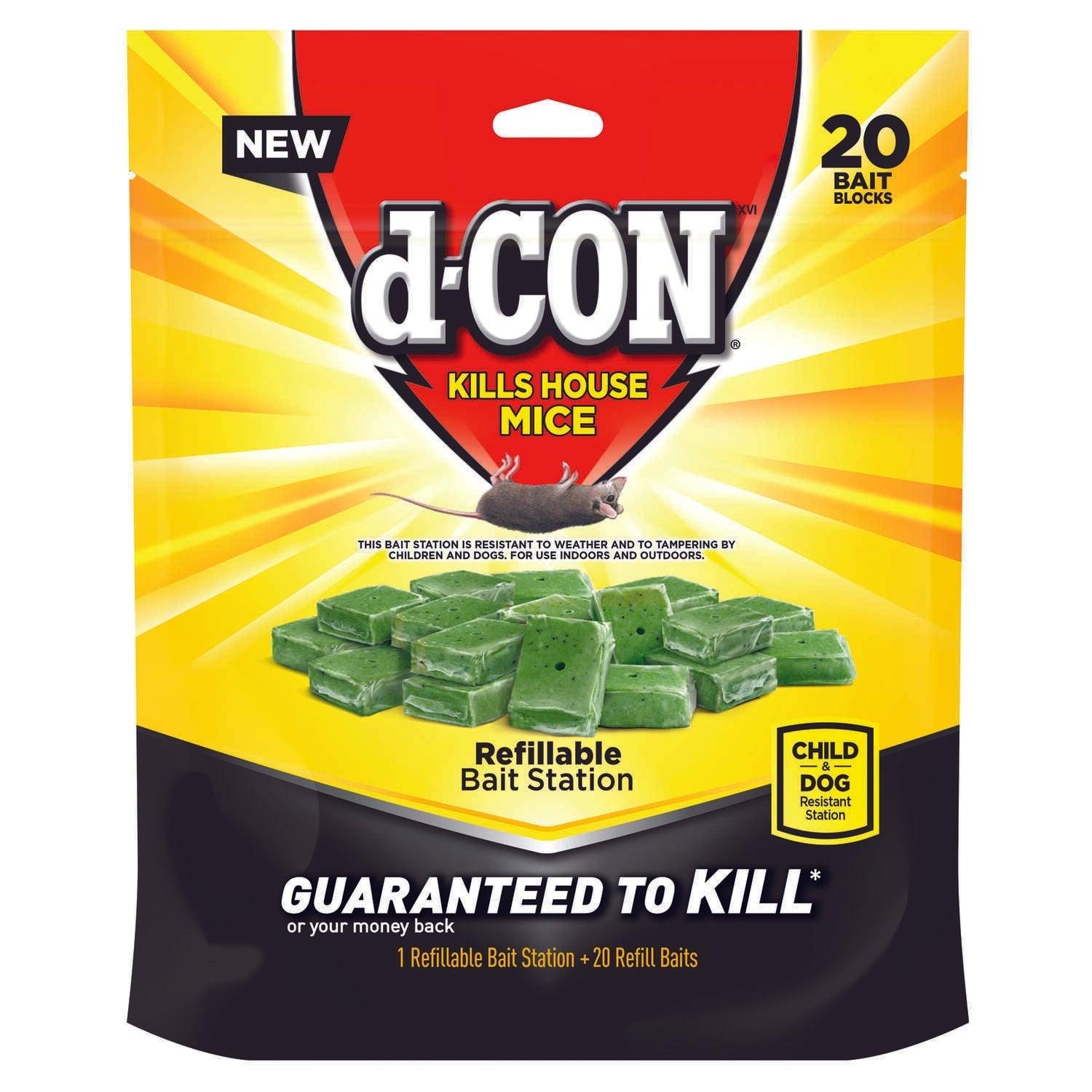 NEW from d-CON! Our new formula is made with 99% food grade ingredients. It is so d-LICIOUS that mice will risk their lives for it. The formula does not contain neurotoxins or anti-coagulants. If you have signs of mice (droppings, footprints, gnawing or scampering noises in your walls), you'll want to try this d-CON Refillable Bait Station. Place the station where you notice signs of mice activity. You'll be able to see the bait through the station to gauge if mice are eating it or not. Once you notice signs of mice feeding on the baits, mouse activity should cease within a few days. If you don't see chew marks on the bait after a few days, try moving it to another area. d-CON Disposable Corner Fit Mouse Poison Bait Stations are discreet, compact & this low profile pre-baited station comes ready-to-use. There is no need to touch the bait when placing the station. This bait station is resistant to tampering by children. Mice get the bait, Kids can't. Weather-resistant station can be used indoors or outdoors. Ideal for: corners, attics, behind appliances, basements, garages and sheds.