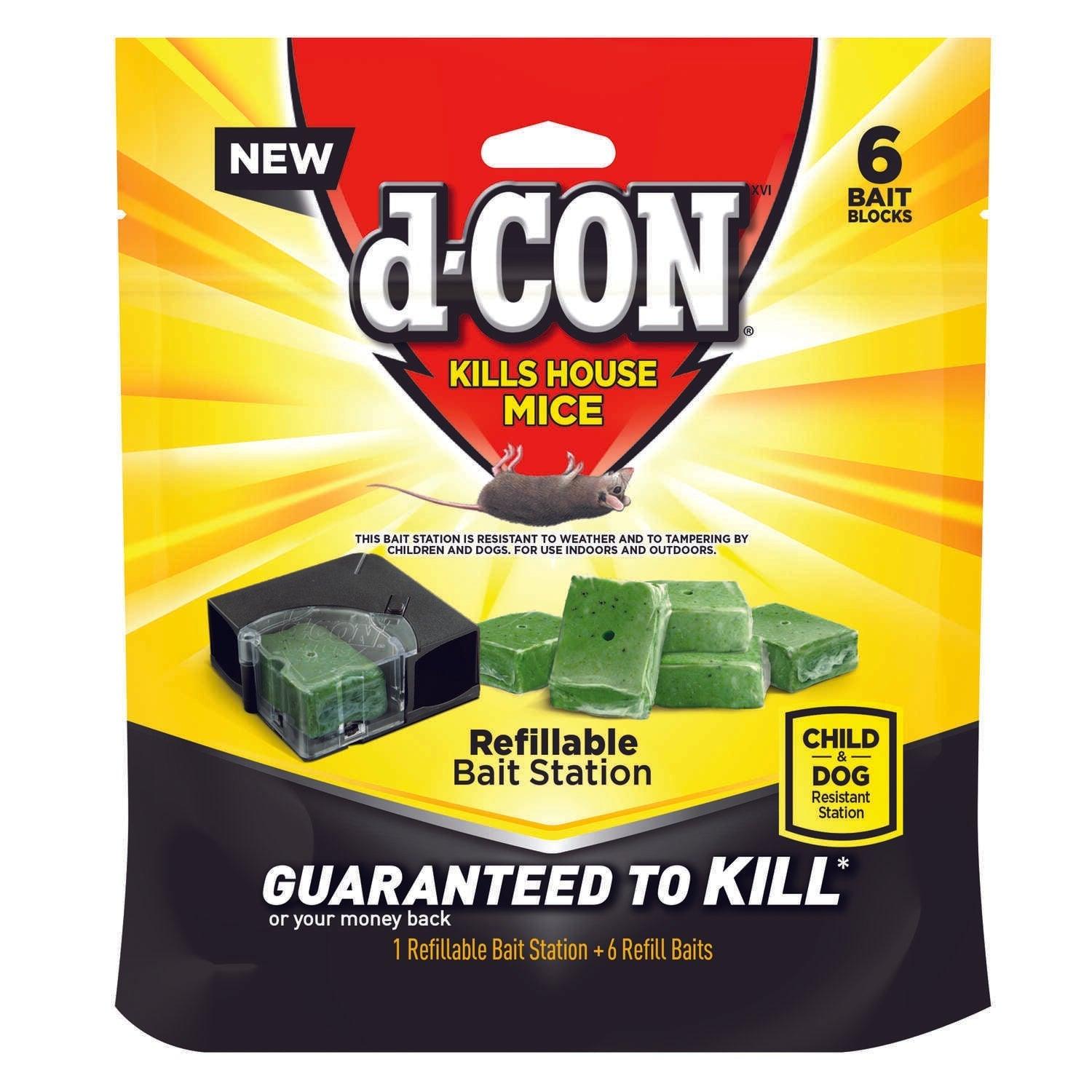 NEW from d-CON! Our new formula is made with 99% food grade ingredients. It is so d-LICIOUS that mice will risk their lives for it. The formula does not contain neurotoxins or anti-coagulants. If you have signs of mice (droppings, footprints, gnawing or scampering noises in your walls), you'll want to try this d-CON Refillable Bait Station. Place the station where you notice signs of mice activity. You'll be able to see the bait through the station to gauge if mice are eating it or not. Once you notice signs of mice feeding on the baits, mouse activity should cease within a few days. If you don't see chew marks on the bait after a few days, try moving it to another area. d-CON Disposable Corner Fit Mouse Poison Bait Stations are discreet, compact & this low profile pre-baited station comes ready-to-use. There is no need to touch the bait when placing the station. This bait station is resistant to tampering by children. Mice get the bait, Kids can't. Weather-resistant station can be used indoors or outdoors. Ideal for: corners, attics, behind appliances, basements, garages and sheds.