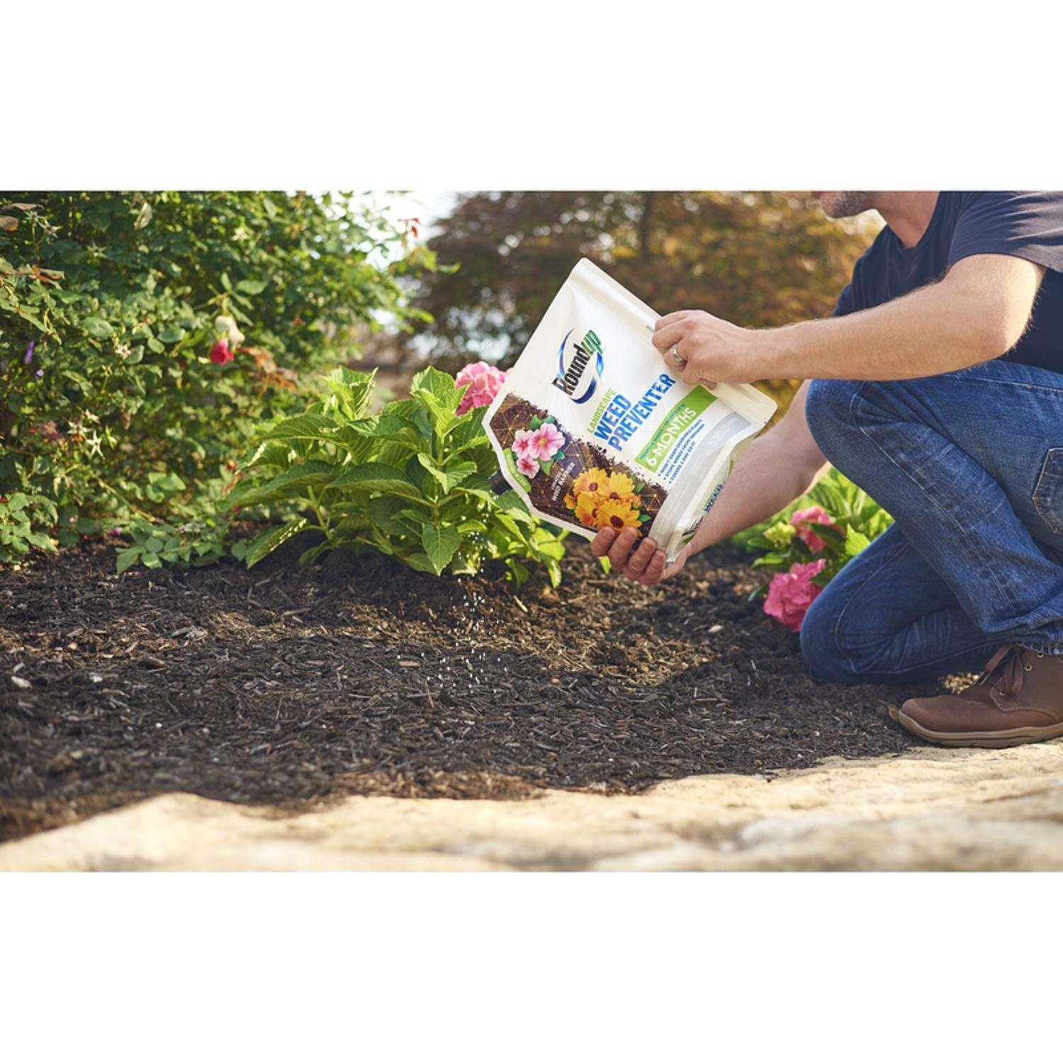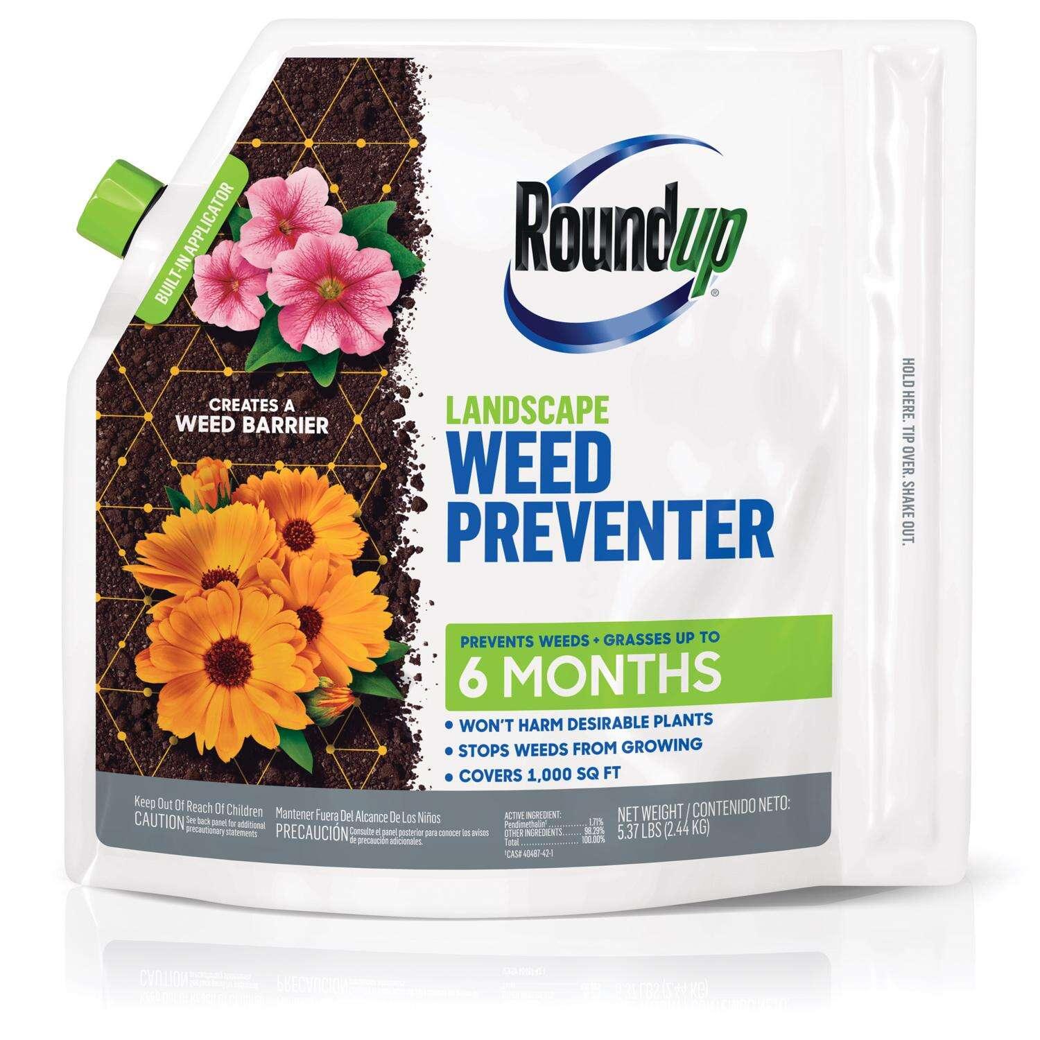 Don't Pull Weeds and Grasses, Prevent Them Introducing Roundup Landscape Weed Preventer which prevents weeds and grasses for up to 6 months It creates a weed barrier and stops weeds from growing. For best results, apply directly to soil around plants in Spring before weeds germinate and before mulching. And when used as directed, it won't harm your desirable plants and flowers The easy to use built-in applicator provides even coverage. Save time and energy with Roundup Landscape Weed Preventer. Outsmart weeds before they appear. A simple step towards a weed free landscape and garden.