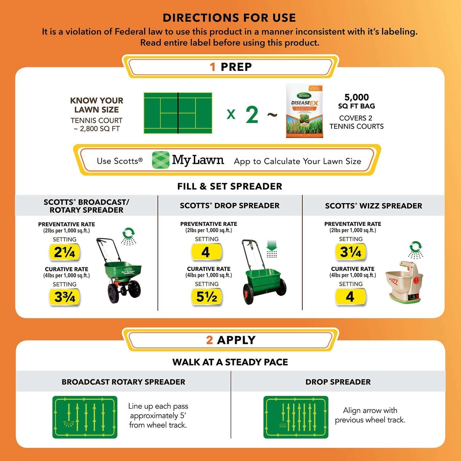 Prevent Brown Patch, Red Thread, and Powdery Mildew, and other common listed lawn diseases from getting in the way of a beautiful green yard with Scotts® DiseaseEx™ Lawn Fungicide. It's preventative when used on any lawn to stop diseases before they appear, and curative when applied on established lawns showing signs of disease. Starts working within 24 hours of treatment and continues to control common broad spectrum diseases for up to 4 weeks. Scotts® DiseaseEx™ controls 26 common diseases like: Brown Patch, Stem & Stripe Rust, Red Thread, Powdery Mildew, Pythium, Southern & Typhula Blight, Pink Patch, Necrotic Ring Spot, Summer Patch, Yellow Patch and more listed diseases. Apply this broad spectrum lawn disease control with a Scotts® Spreader. People and pets may re-enter the treated area after application. For best results, begin applications prior to symptoms of disease. May be applied after seeding or at seed germination. A 10-lb. bag treats up to 5,000 sq. ft.