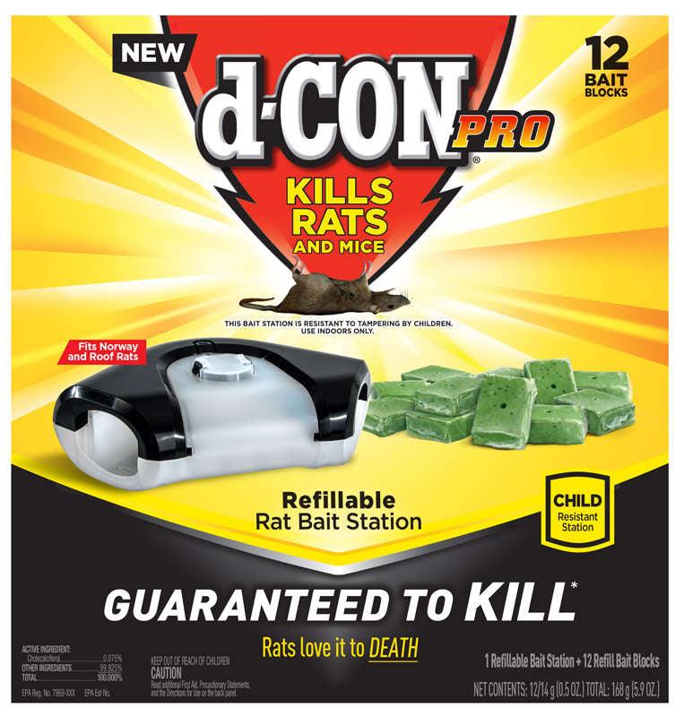 Refillable rat bait station. Includes 1 bait station and 12 refill bait blocks. Ideal to control Norway rats, roof rats, and house mice. Resistant to tampering by children.