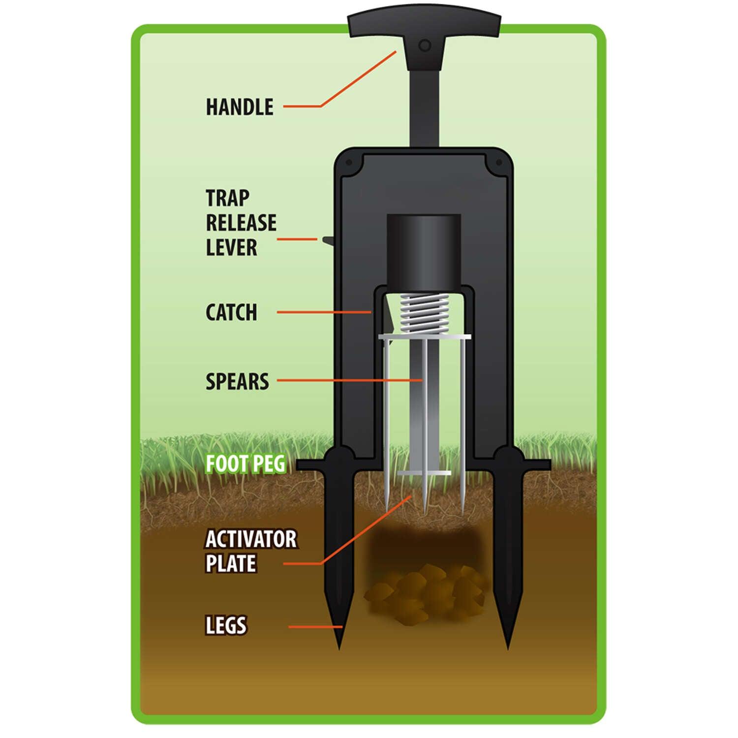 Anyone who has ever struggled to set a mole trap will appreciate how effortless it is to activate the Victor Deadset Mole Trap. The trap boasts an ergonomically designed, easy grip handle and an oversized activator plate that can be pushed into the tunnel by hand or foot, making it the easiest-to-set trap on the market. It's also incredibly effective thanks to the precision-built trigger system, which is activated by the slightest movement. When underground movement is detected, the spears are thrust into the ground, quickly killing the mole. For your convenience, the trap comes fully assembled and ready-to-use. After identifying active tunnels, collapse a portion, then use the foot pegs to set the trap in place in the softened ground. Raise and lower the handle until the spears move freely in the ground. Then, with feet on the foot pegs, raise the handle to set the trap. You can have peace of mind in knowing that the trap’s spears are located below ground, away from children and pets.