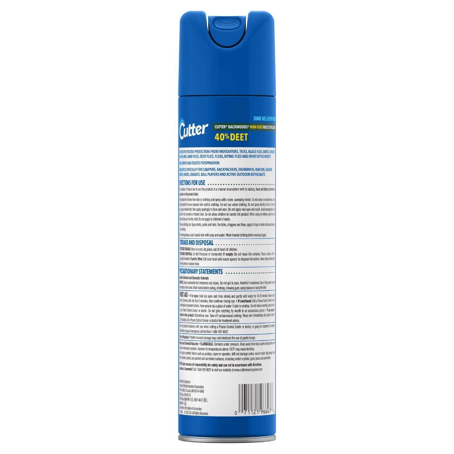 Cutter Backwoods High DEET Insect Repellent aerosol is formulated with 40% DEET for effective, long-lasting protection for all of your outdoor activities. This formula repels mosquitoes that may transmit the Zika, West Nile, Dengue and Chikungunya viruses. Use this insect repellent for hours of effective protection from mosquitoes, ticks, black flies, gnats, chiggers, no-see-ums, sand flies, deer flies, biting flies and other biting insects. The aerosol formula is developed especially for campers, backpackers, fishermen, hunters, golfers, bikers, hikers, joggers, ball players and active outdoor enthusiasts. Non-greasy Cutter Backwoods High DEET Insect Repellent resists perspiration to offer insect protection when you need it most.