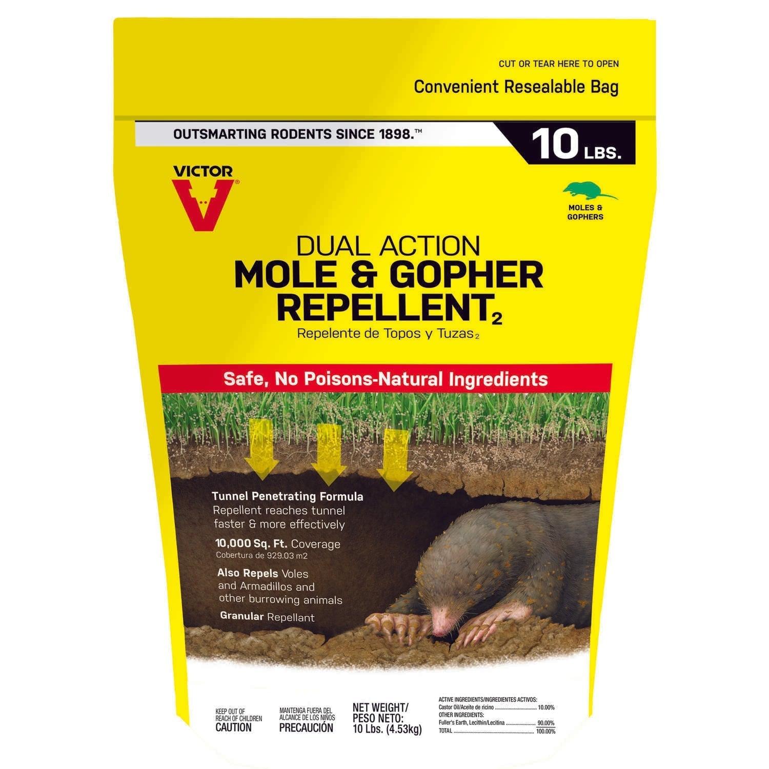 Stay a step ahead of mole and gopher invaders with Victor Mole & Gopher Repellent. It uses a dual action formula to target the senses of burrowing animals, such as moles, gophers, voles, armadillos, and more. It’s formulated with castor oil, so it’s safe to apply on lawns and gardens when used as directed. Plus, the 10 lb bag offers up to 10,000 square feet of coverage. For your convenience, this repellent comes in a resealable bag for easy storage. After applying, water the product into the ground to activate the granules. Once watered in, the granules will penetrate underground tunnels, making the ground smell and taste unpleasant and drive them away before they have a chance to do further damage around your yard. Avoid treating the entire lawn in one application – this may cause moles to tunnel wildly in any direction to escape the repellent. Applying the granules over the lawn in stages will steadily herd moles away from the treated lawn area.