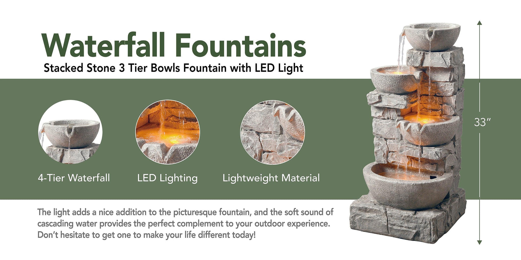 Peaktop - Outdoor Stacked Stone Tiered Bowls Fountain w/ LED Light