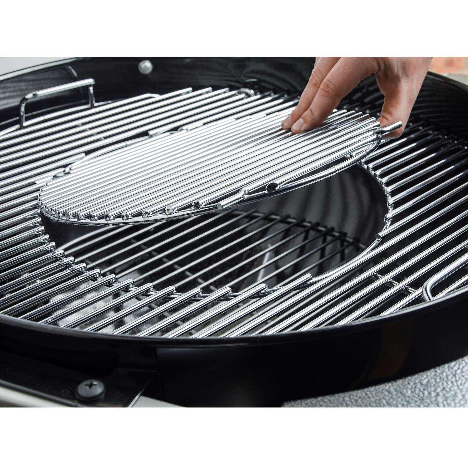 • Cooking grate is compatible with GBS inserts and is hinged for easily adding charcoal while grilling