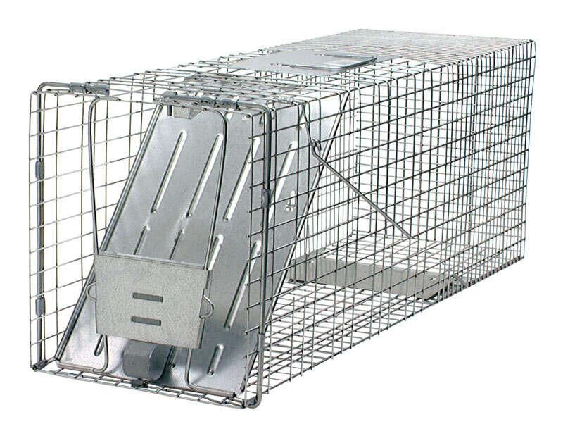 The Havahart Large 1-Door Animal Trap is an all-metal, live cage trap designed by professional trappers. It features a spring-loaded door for safe, secure catches. Animal control officers also trust and use these live animal traps -- so can you! Use it to trap raccoons, opossums, skunks, armadillos, groundhogs and other similar-sized pest animals. Havahart one-door animal cage traps are constructed of sturdy, rust-resistant wire mesh with steel reinforcements and measure approximately 32 inches long. Each trap is built to last and galvanized for maximum resistance to rust and corrosion, making it an ideal solution for your long-term trapping goals. This trap includes mesh openings that are smaller than competing traps of comparable size, which prevent escapes and stolen bait. A solid, locking door and sensitive trigger ensures quick, secure capture that targets a specific animal size while eliminating undesired catches. Solid handle guards also protect the user while transporting an animal. At the same time, smoothed internal edges protect and prevent the animal from injuring itself.