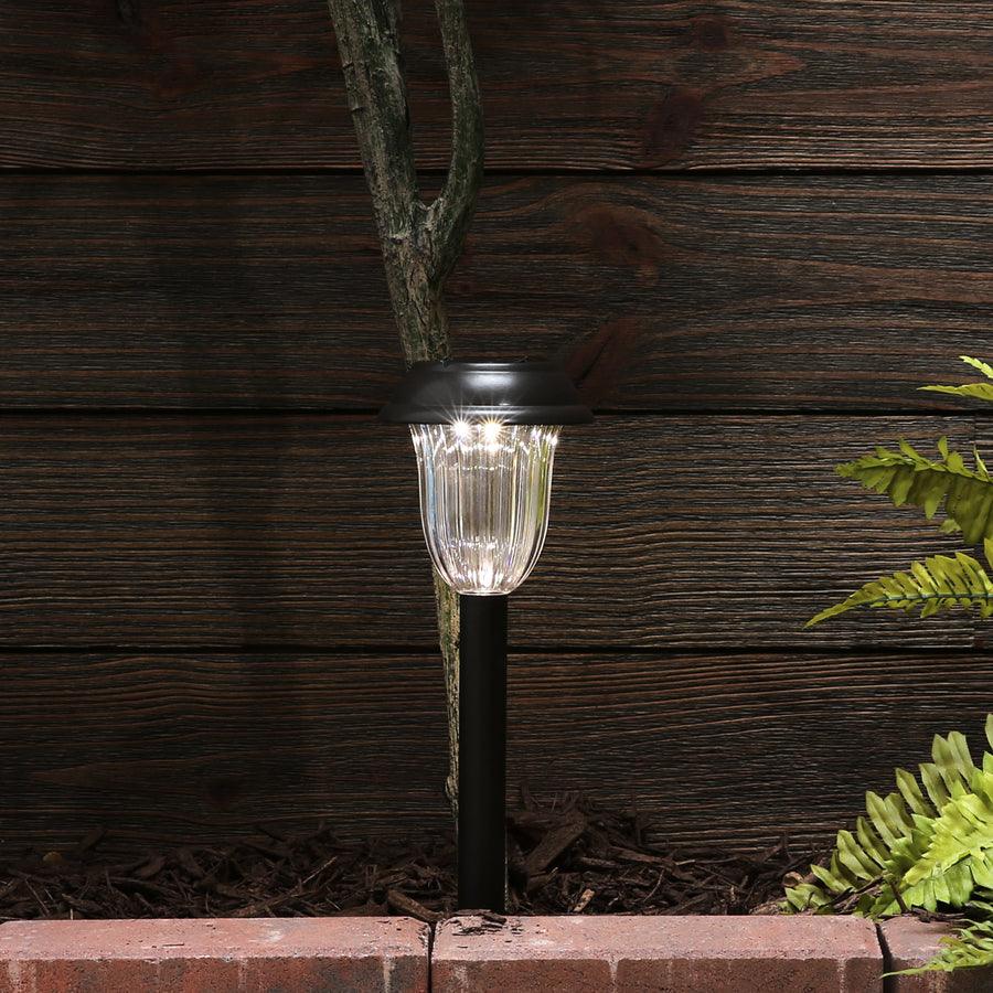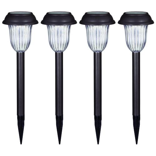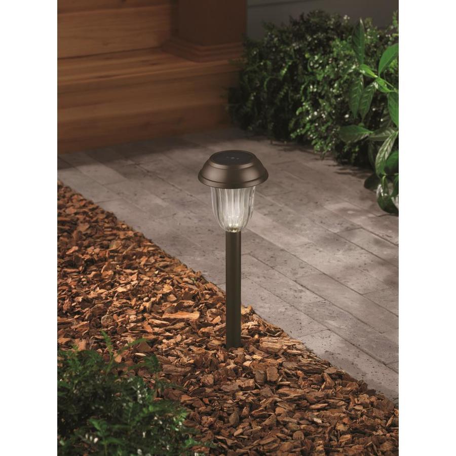Portfolio 4-pack LED path light kit casts a striped, star-like pattern of light in your pathway, garden or patio space Kit includes 4 charcoal brown finish path lights, 4 stakes and 4 rechargeable solar batteries 900mAh AA solar batteries offer up to 8 hours of run time on an average sunny day’s charge (replacement batteries available at Lowe’s) LED technology means no maintenance or bulb replacement is required Photocell controlled dusk-to-dawn sensor adds security to your property Stainless steel construction resists corrosion and provides outdoor durability Clear plastic lens radiates a soft, white glow at 5 lumens Perfect for pathways, driveways and entryways