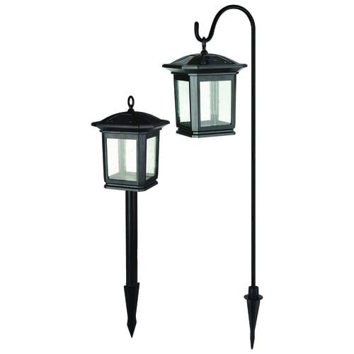 Includes (2) lights, (2) solar rechargeable batteries, (2) stakes and (2) shepherd's hooks