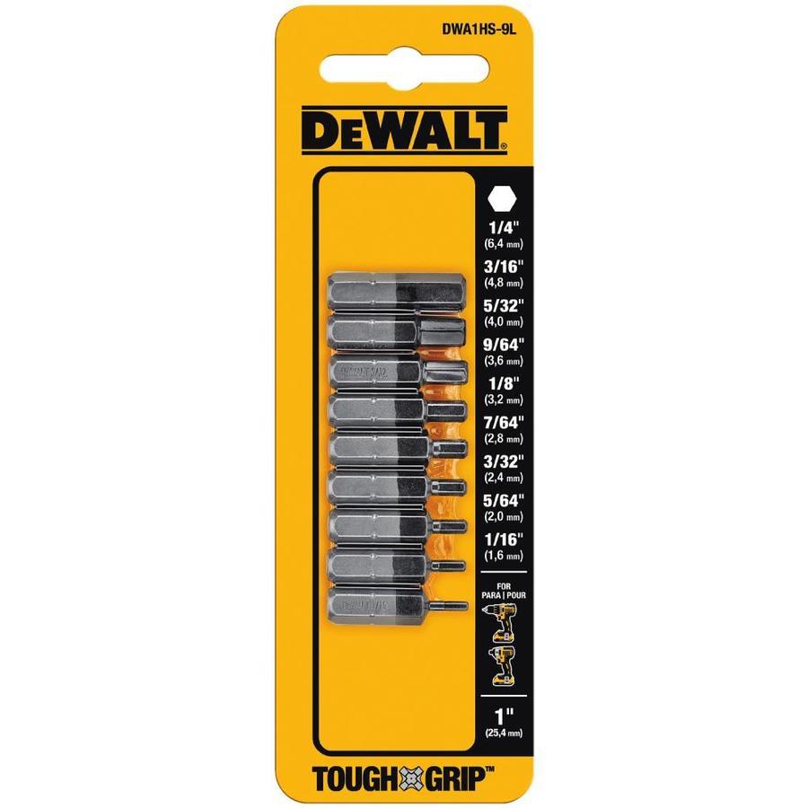 Includes 9 bits: 1/16-in, 5/64-in, 3/32-in, 7/64-in, 1/8-in, 9/64-in, 5/32-in, 3/16-in and 1/4-in Optimized for exact fastener fitment to reduce cam-out Full hex design increases bit tip strength Heat treat maximizes torque