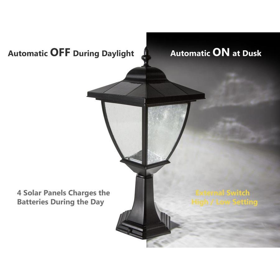 High performance solar lights stays lit for up to 10 hours Lights up every night/on off switch, high low setting 4 High output surface mount LED -3x brighter than standard LED's 2 Long life 3.2 V 1100 MAH rechargeable batteries included Manufactured from durable cast aluminum Real beveled glass 6 in. x 6 in. post mount and 7 in. x 4 in. wall mount included Quick and easy do-it-yourself installation 130 Lumens – high level, 70 Lumens – low setting