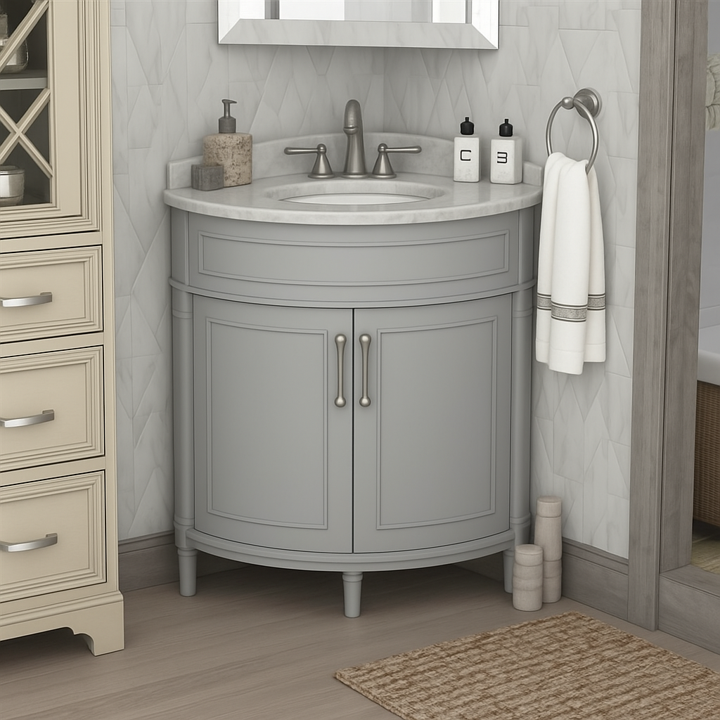The Aberdeen 32-inch corner vanity combines timeless design with practical functionality. Featuring a dove gray finish, Carrara marble countertop, and soft-close doors, it offers elegance and convenience for your bathroom.
