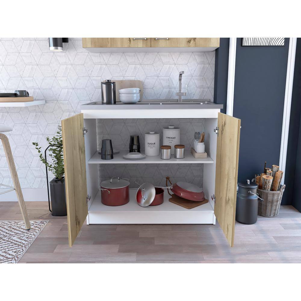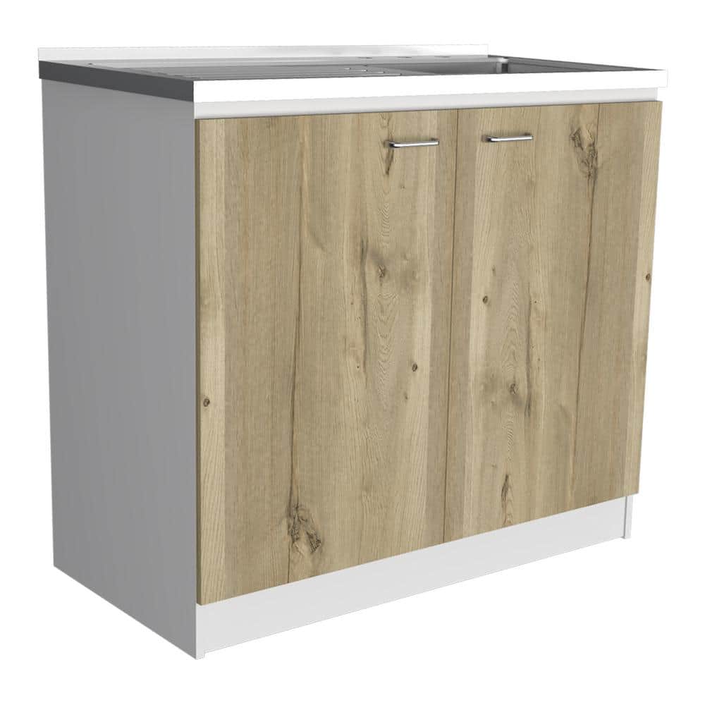 A: Yes, the sink and cabinet come in a consistent beige finish, providing a unified look for your laundry room.