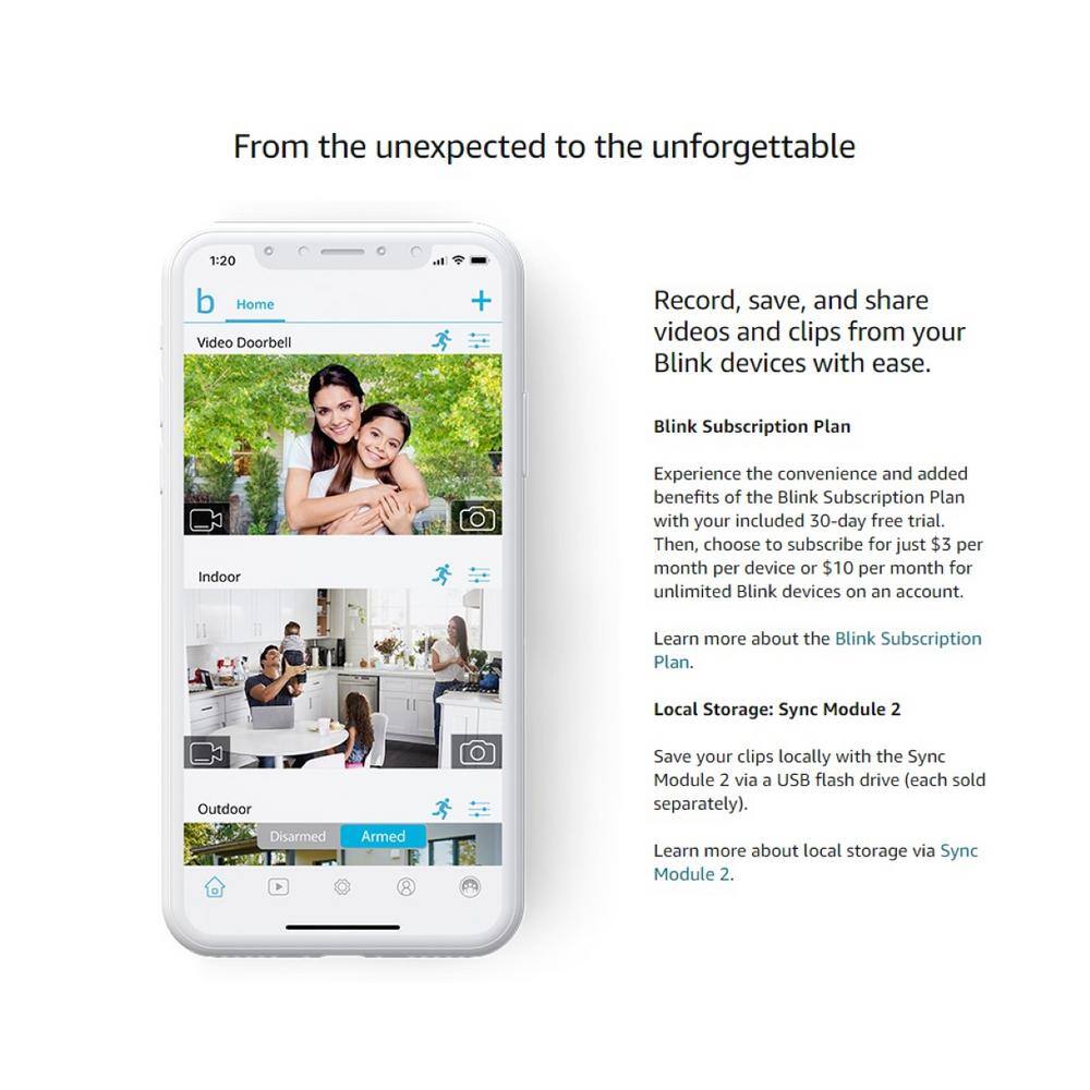 A: You can choose between cloud storage with a free 30-day trial or local storage via a sync module and USB drive (sold separately).