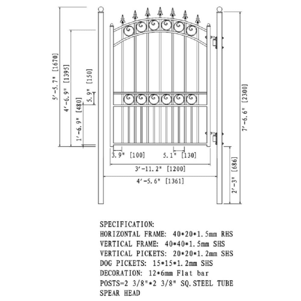 A: The gate measures 4 ft. in width and 5 ft. in height, making it suitable for standard pedestrian access.