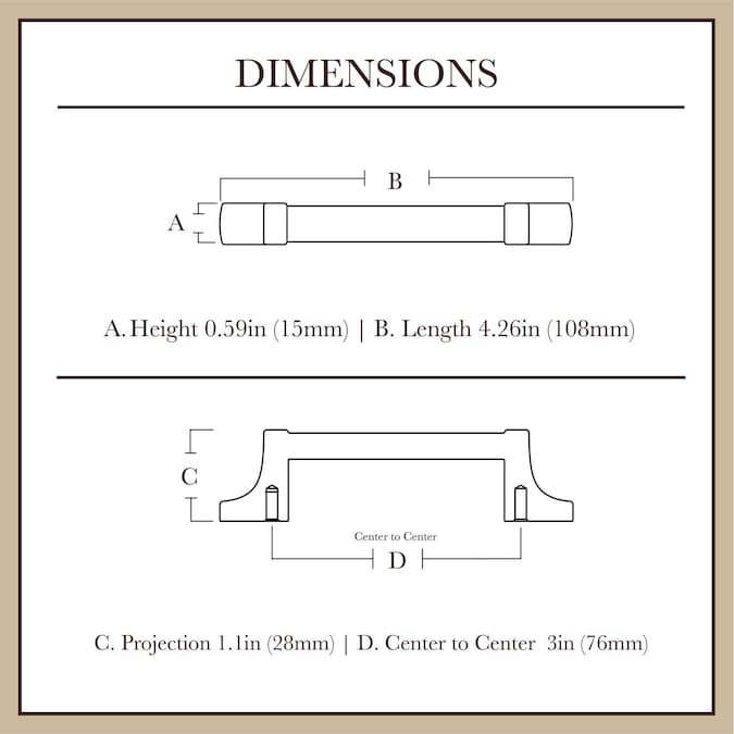 A: The Arthur drawer pull is rear-mounted with a center-to-center measurement of 3 inches (76 mm). It includes installation hardware with (2) 1-in screws suitable for door or drawer faces 5/8-in to 3/4-in thick.