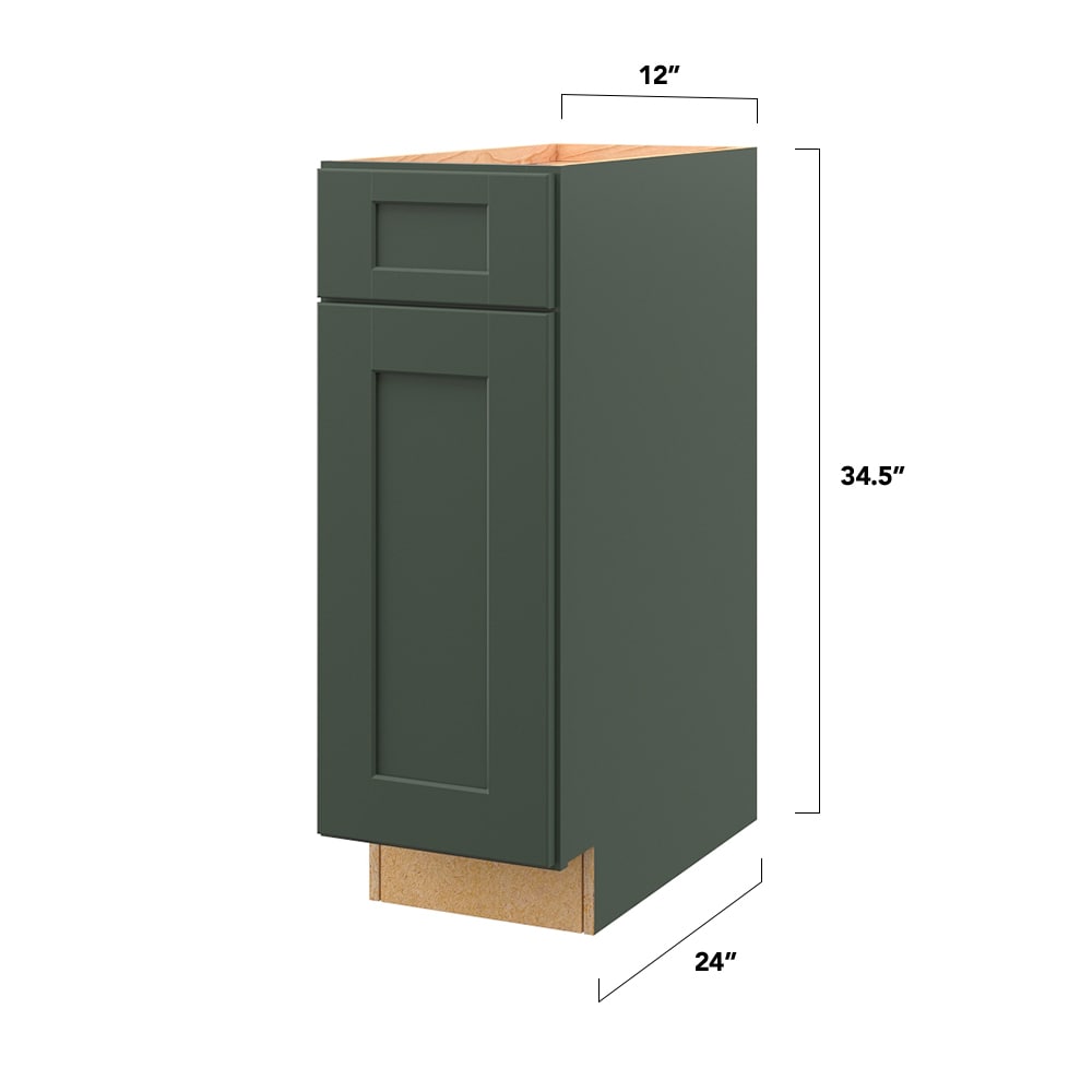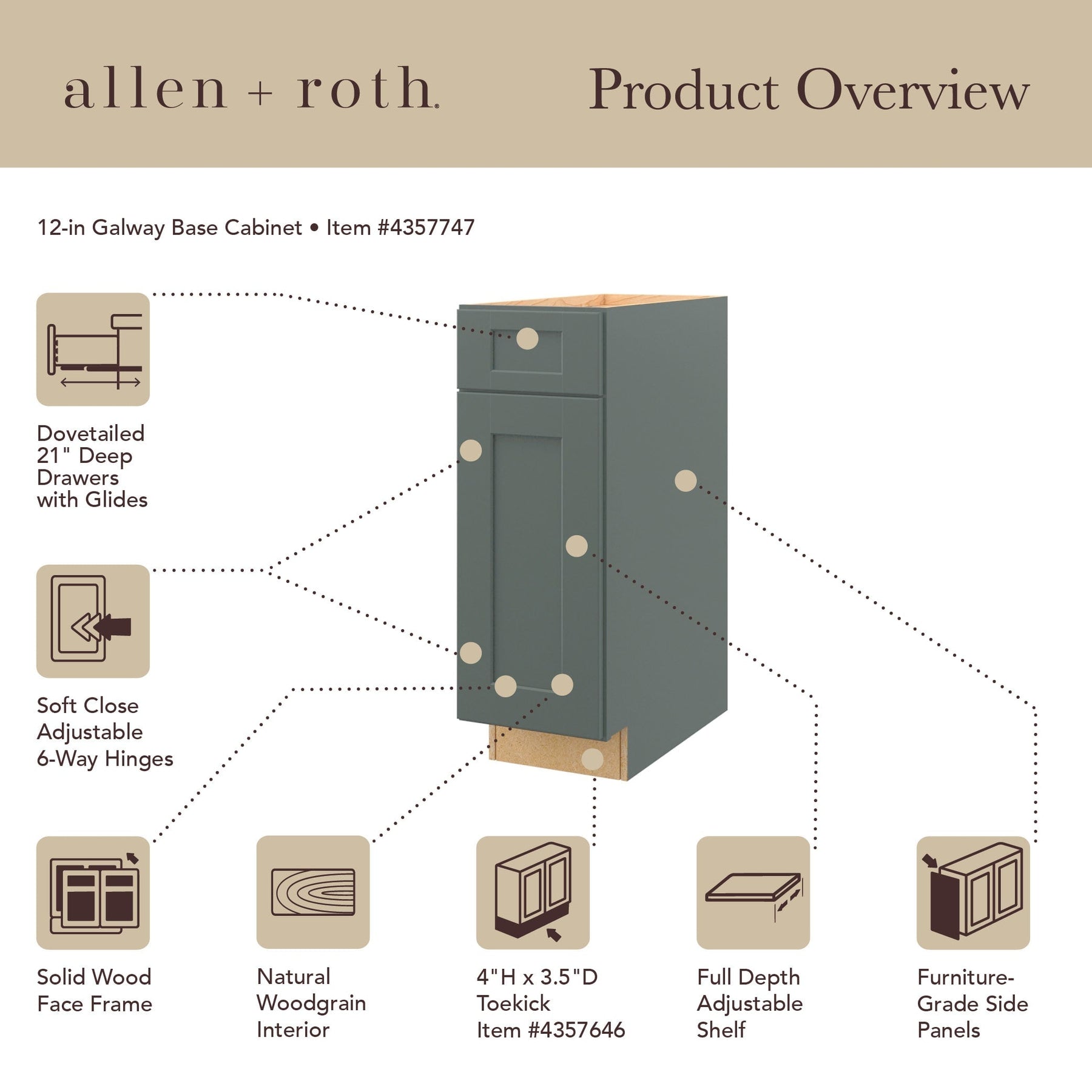 Elevate your cabinetry with the allen + roth Galway Sage Base Cabinet. This 12-inch wide, fully assembled cabinet boasts a painted Shaker-style front, unveiling a modern aesthetic that enhances any living space. Perfect for kitchen or bath, its soft-close functionality and reinforced construction promise enduring reliability and seamless elegance.