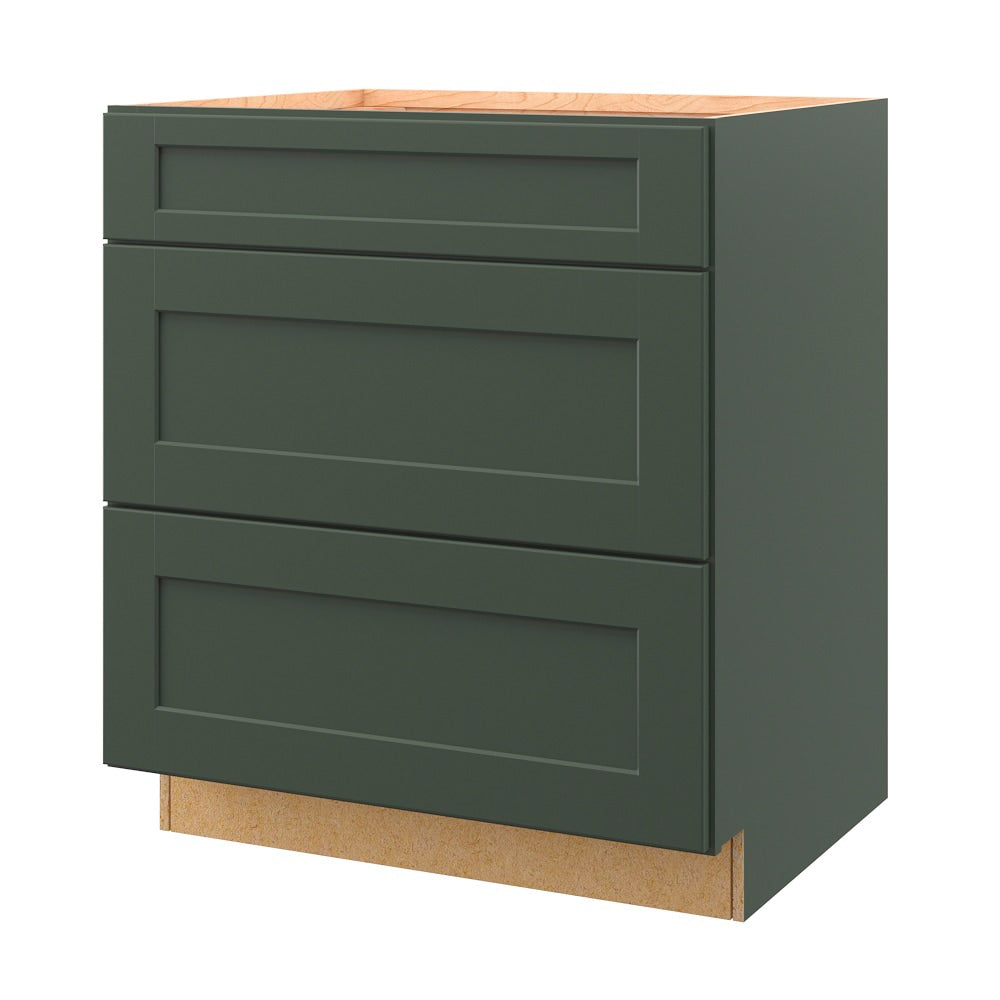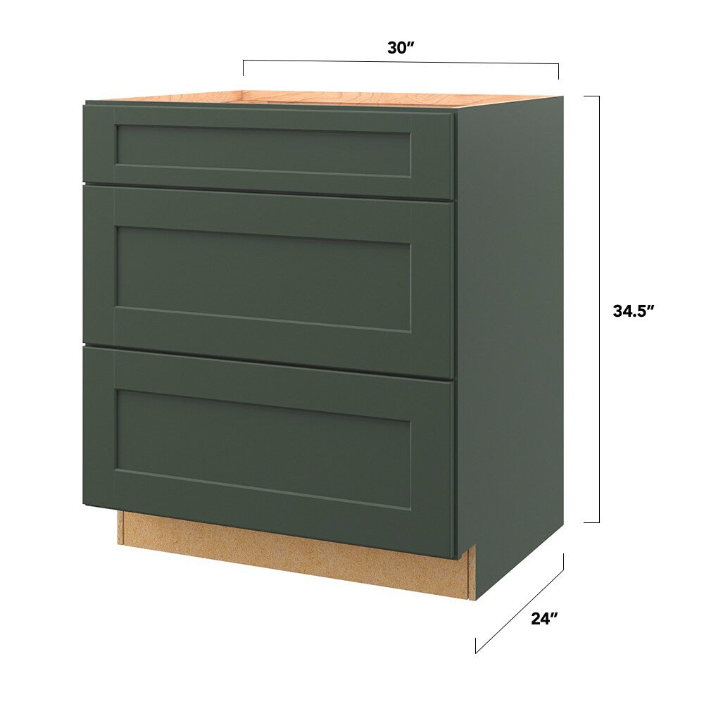 Enhance your kitchen or workspace with the allen + roth Galway 3-Drawer Base Cabinet. Featuring a serene sage finish, this fully assembled cabinet brings timeless style and superior durability with its blend of hardwoods and engineered materials. Its soft-close drawers and robust construction ensure quiet operation and long-lasting use, perfect for busy environments.