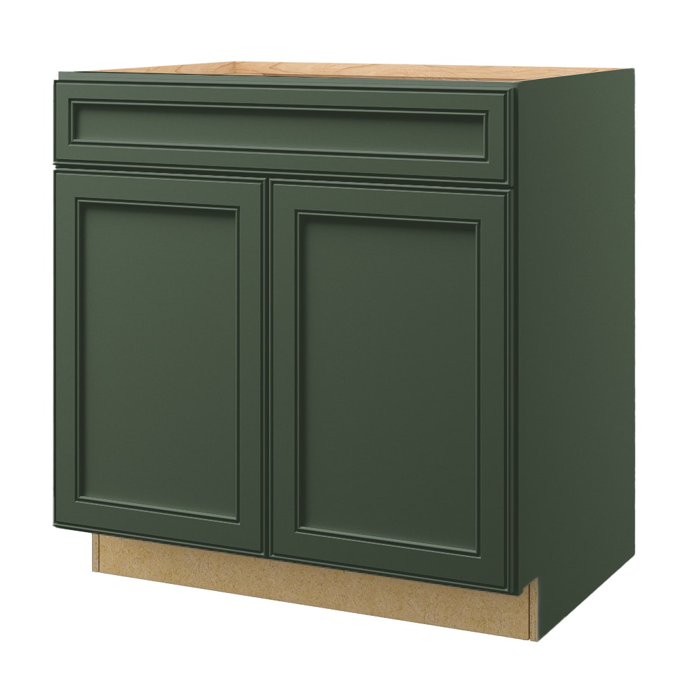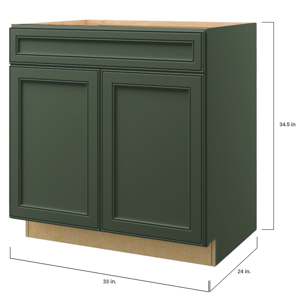 The allen + roth Heathrow Sink Base Cabinet offers exquisite transitional style and superior durability with its sage painted finish. This fully assembled cabinet features a mitered recessed panel design and soft-close doors that ensure effortless, silent operation. A stunning addition to any kitchen, this cabinet perfectly balances functionality and aesthetic appeal for your home improvement projects.