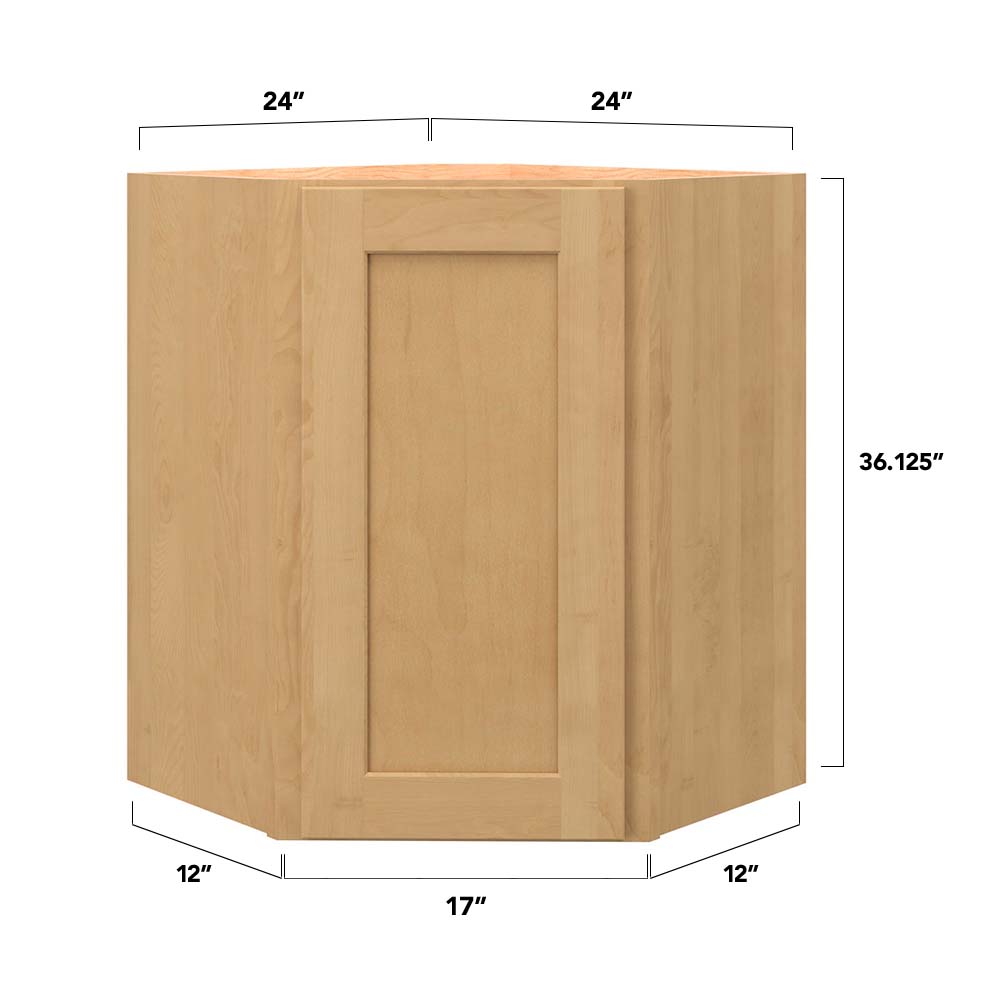 The allen + roth Innsbrook Rye Diagonal Corner Wall Cabinet combines style and functionality with its warm light stain and space-efficient design. This fully assembled shaker style cabinet features soft-close technology and pressure-fitted frames for lasting durability, making it an elegant and practical choice for any kitchen or living space.