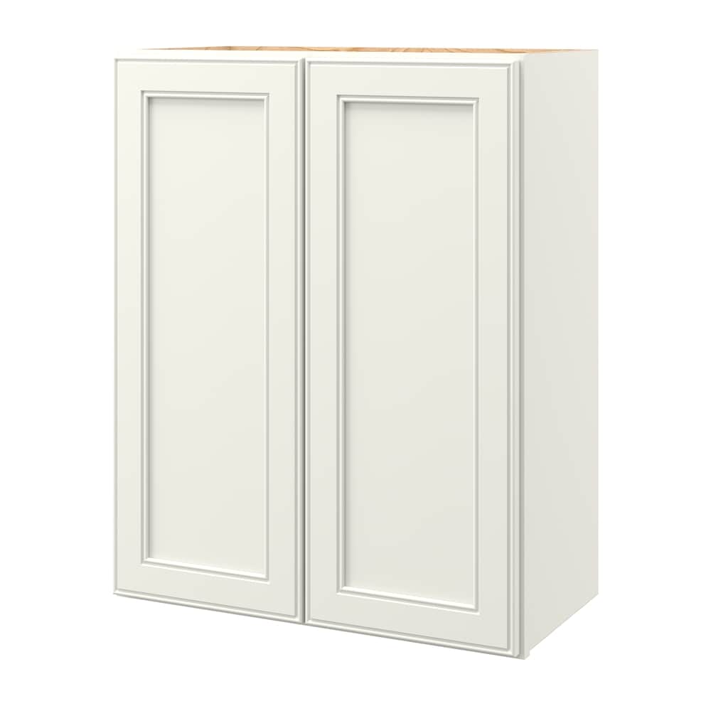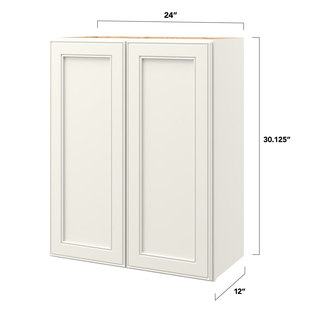 The allen + roth McKeller 24" Linen Wall Cabinet offers a blend of durability and elegance with its mitered flat panel door design. Finished in a crisp linen color, it is crafted to seamlessly enhance modern environments while providing effective storage solutions. Ideal for kitchens or bathrooms, this cabinet exemplifies fine craftsmanship and fitted construction.