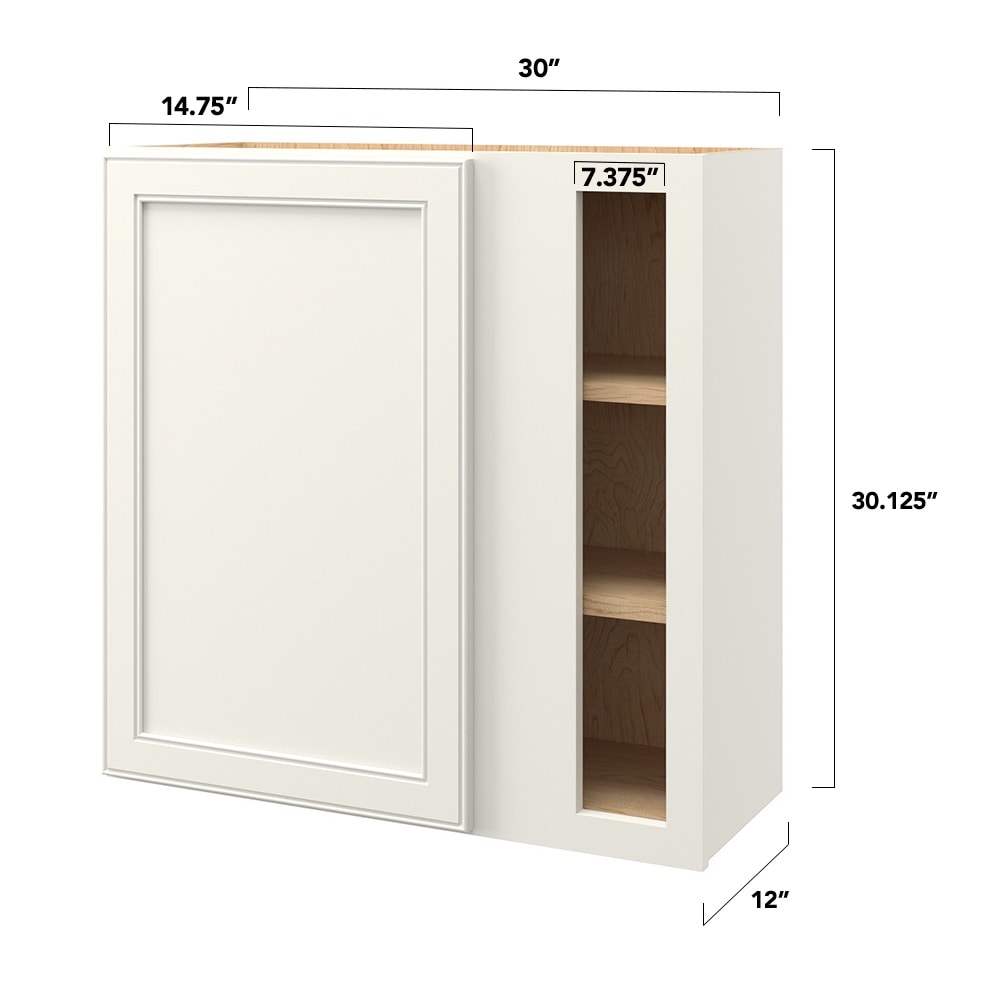 The allen + roth McKeller Linen Blind Corner Wall Cabinet features a sleek, transitional design with a flat panel mitered door, perfect for modern or classic kitchen spaces. It boasts a soft-close functionality for silent accessibility and comes fully assembled for effortless installation.