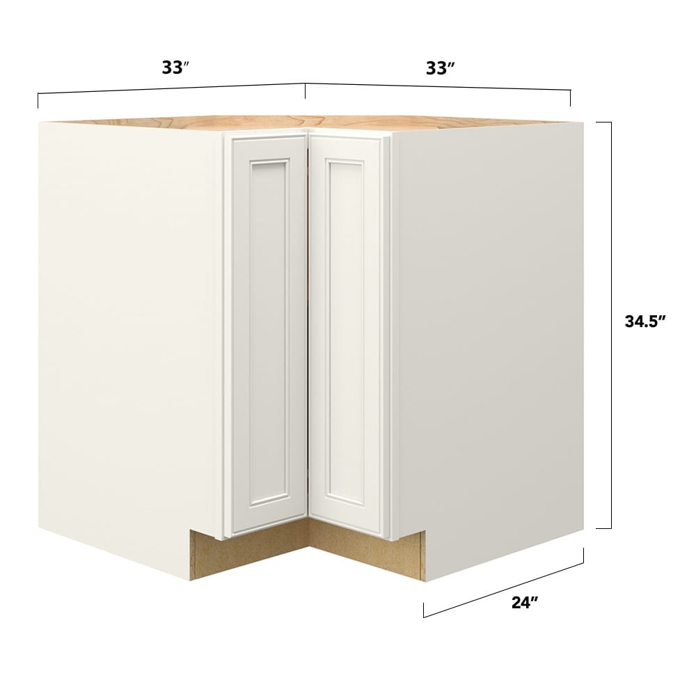 The McKeller Linen Diagonal Corner Base Cabinet by allen + roth delivers aesthetically pleasing sophistication to any kitchen space. Expertly crafted for long-lasting durability, this cabinet features a true painted finish and flat panel mitered doors, combining solid woods with engineered materials. Command attention with its seamless design and proudly display it in your next home renovation project.